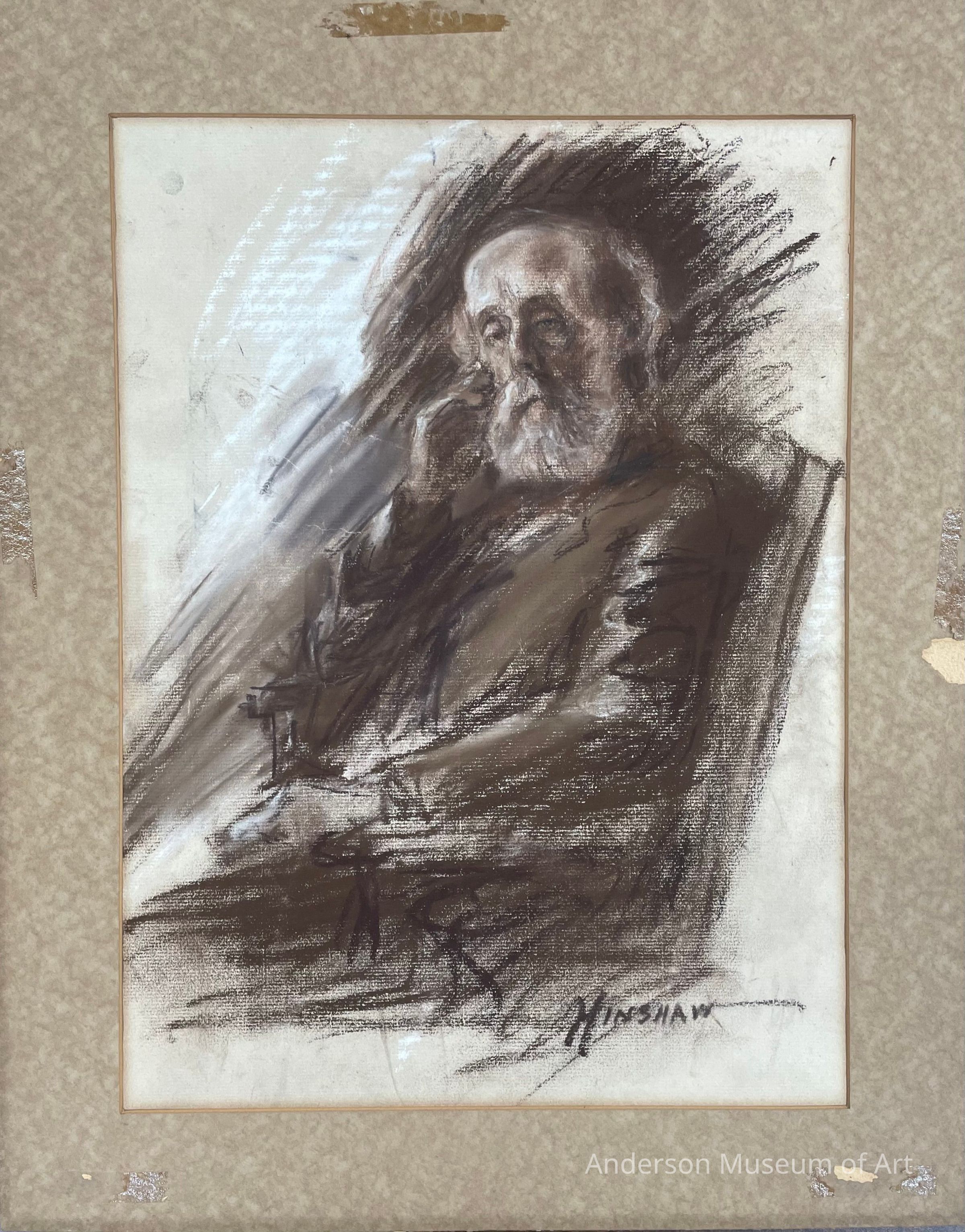 Pastel portrait of a man sitting in a chair. His body is facing the viewer's left but he is looking at the viewer, though eyes are a little downcast. His right elbow is on the chair and his right hand is resting on his cheek. The man is older with a gray beard and hair and balding on top. He looks to be in a suit. The drawing is on a tan paper and signed Hinshaw in black pastel in the BRC.