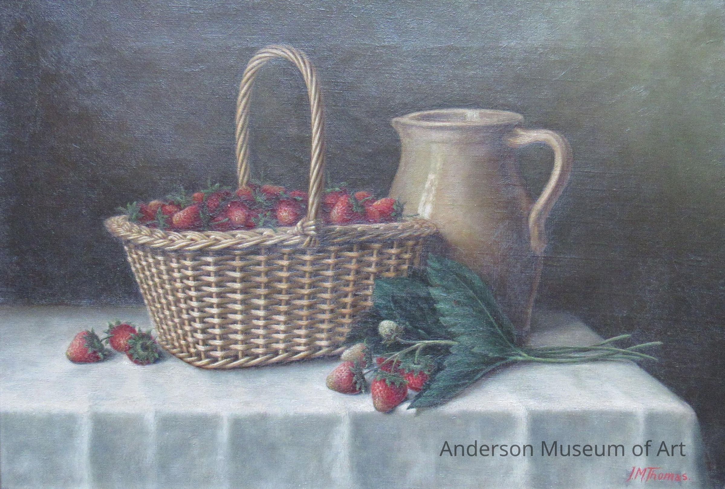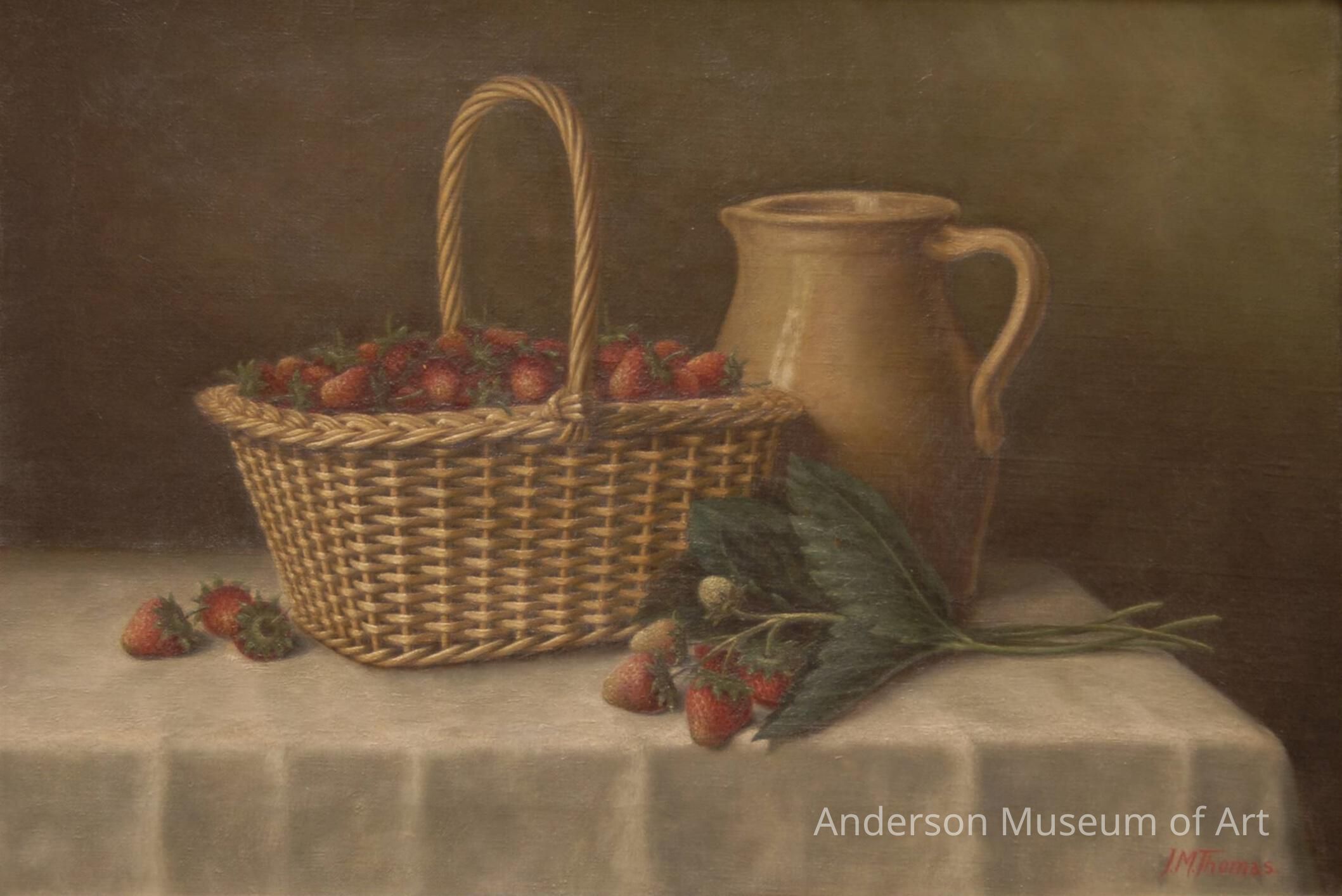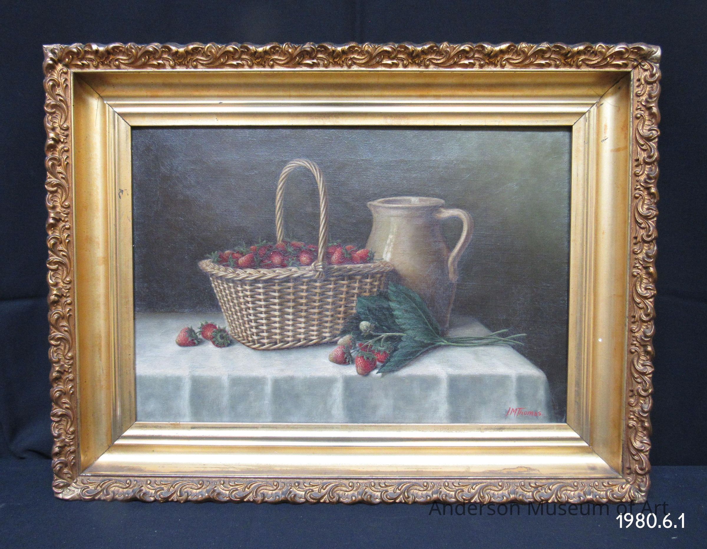 Still life with wicker basket filled with strawberries and a clay pitcher to the right on a table. There are three strawberries to the left of the basket and strawberries with leaves in the front. All of this is sitting on a table with a white tablecloth. Background is brown with a light source coming in from the top right.