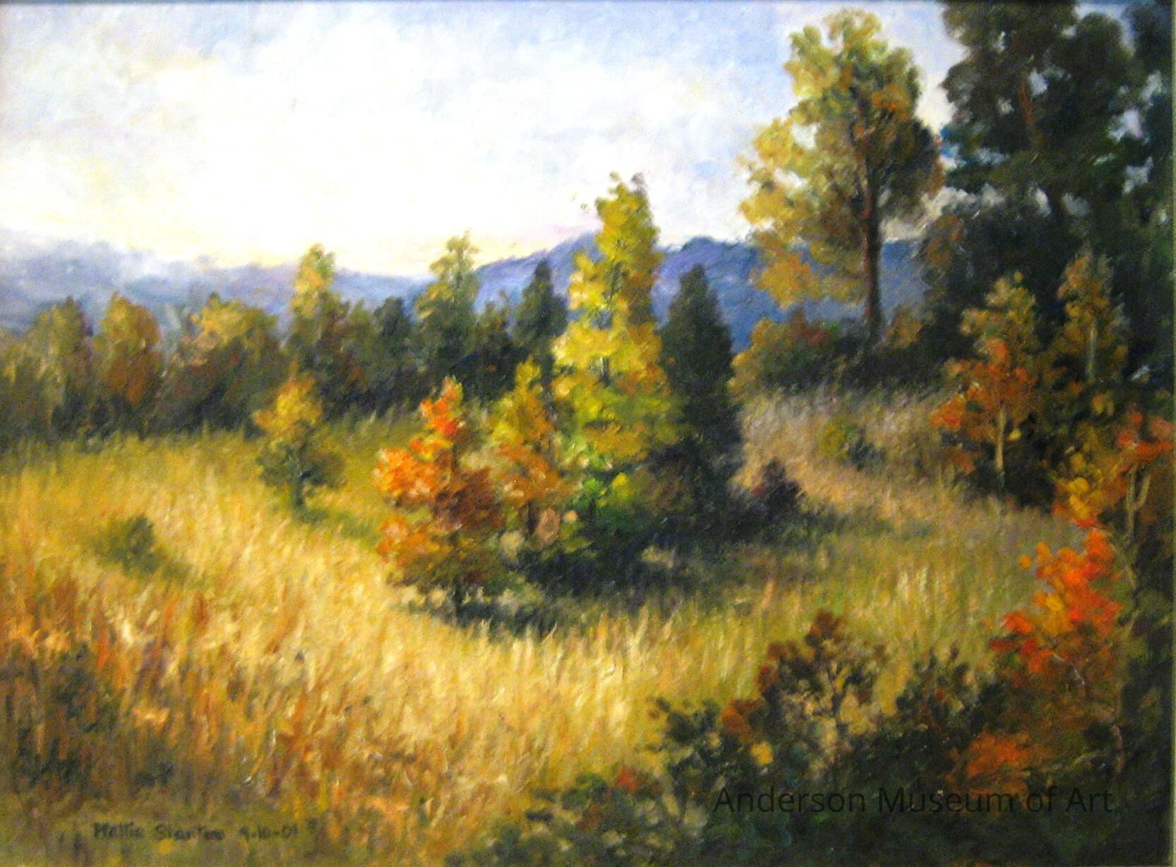 Impressionistic style landscape in warm golds and greens. Depicts a prairie with a grouping of trees in the center as well as trees along the right side and a row across the horizon line. There are mountains in the distance.