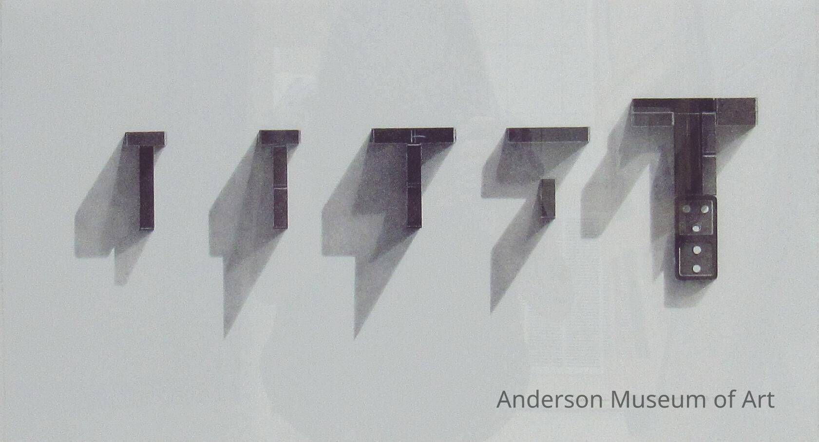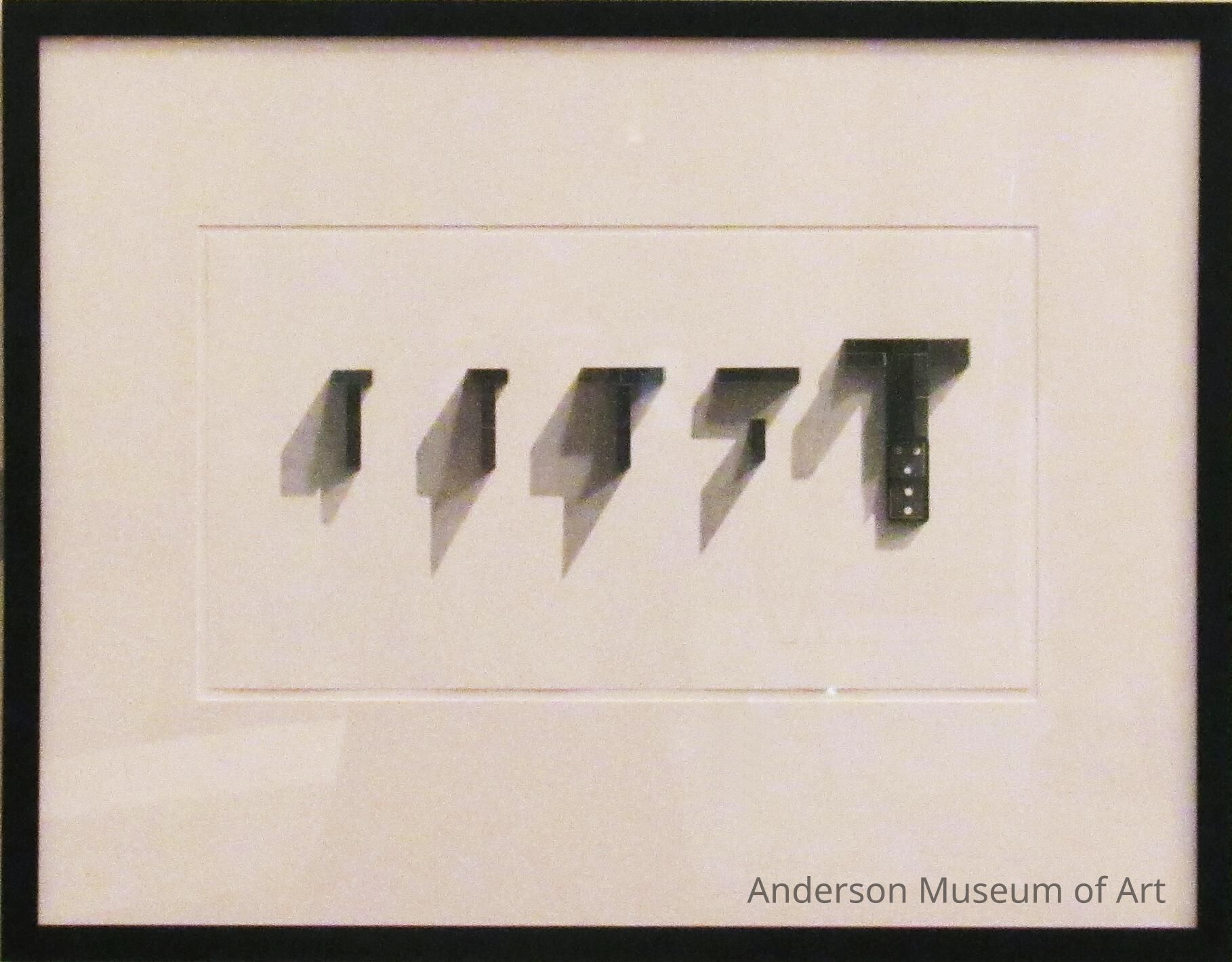 Five groups of dominoes on their sides. The first group makes a T out of two dominoes. The second makes a T out of three. The third makes a T out of four. The fourth makes T out of three but leaves a space where they connect. The last makes the largest T out of ten with the bottom eleventh on flat. There are three dots and two dots on this domino. Each set of T dominoes casts a heavy shadow to its bottom left. Signed "Secrets' Tease, 2-3-4-5 54/65 Charles Massey, Jr. 1983" in pencil on the bottom right corner.