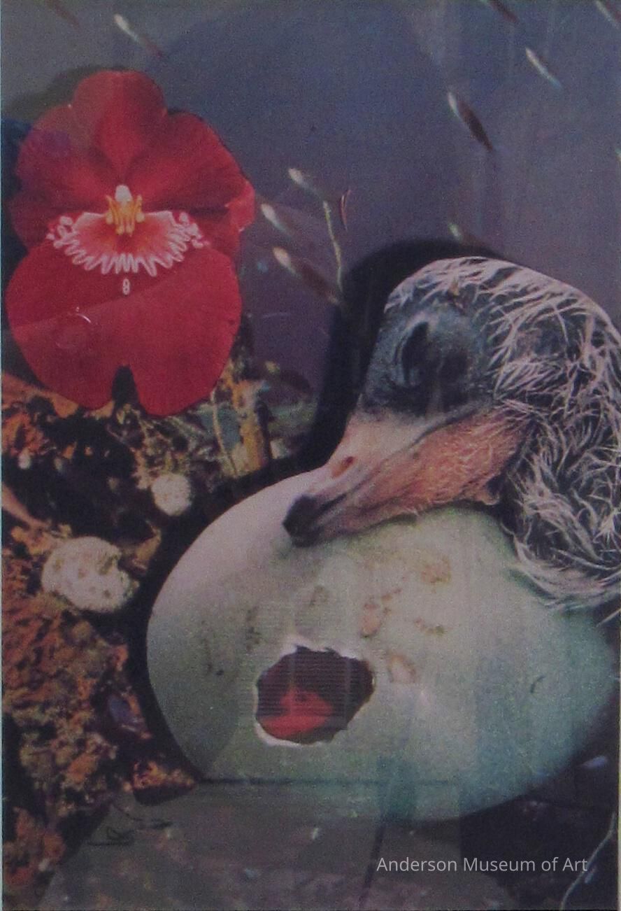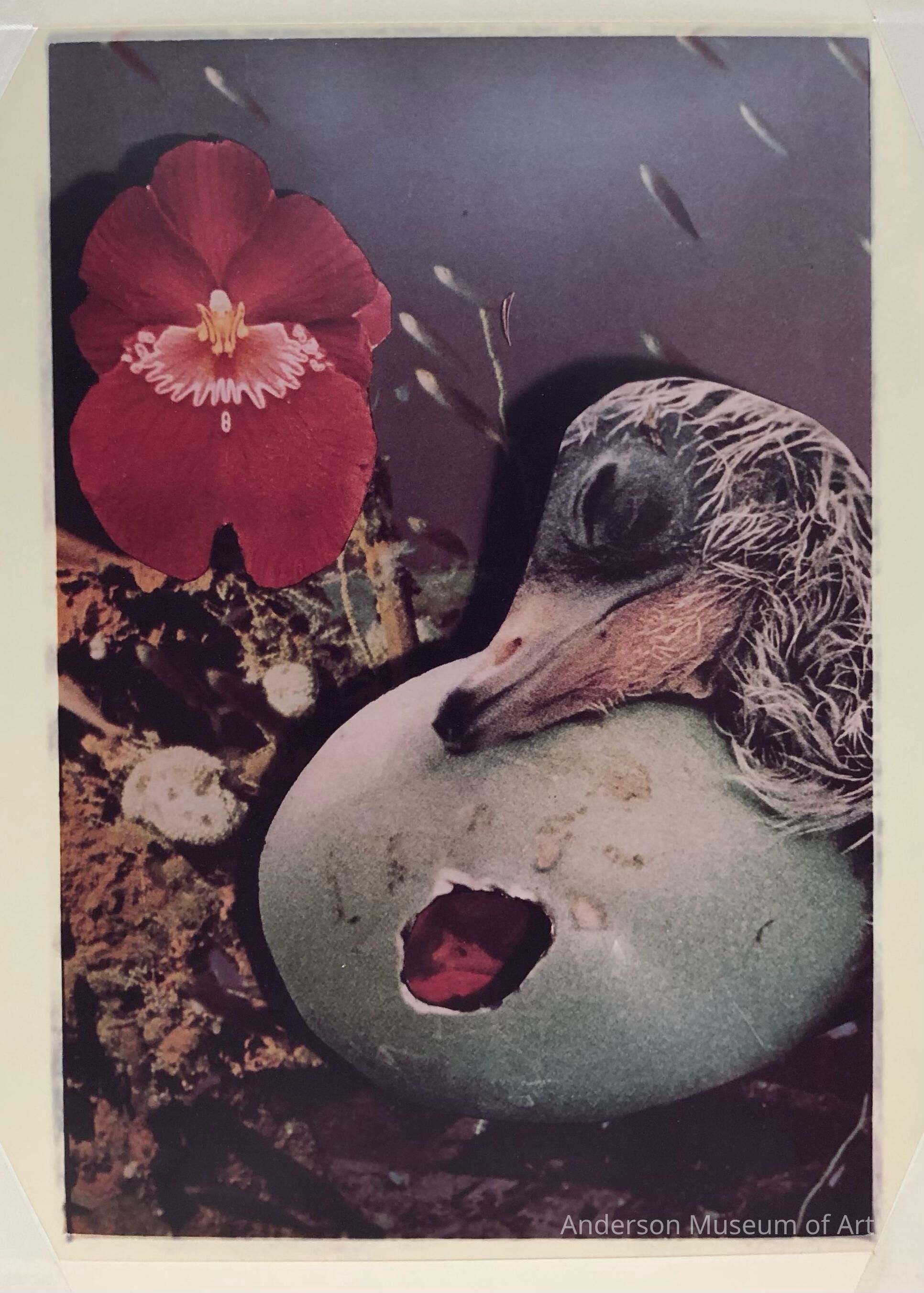 Color photograph depicting a surreal composition. In the right foreground appears a large bird's egg with a hole in it revealing a distorted image of a portrait tinted red. The head of a baby bird rests on top of the egg. To the left of the egg are what appear to be white mushrooms or fungi amidst leaves and stems. Above these is a large red flower. In the