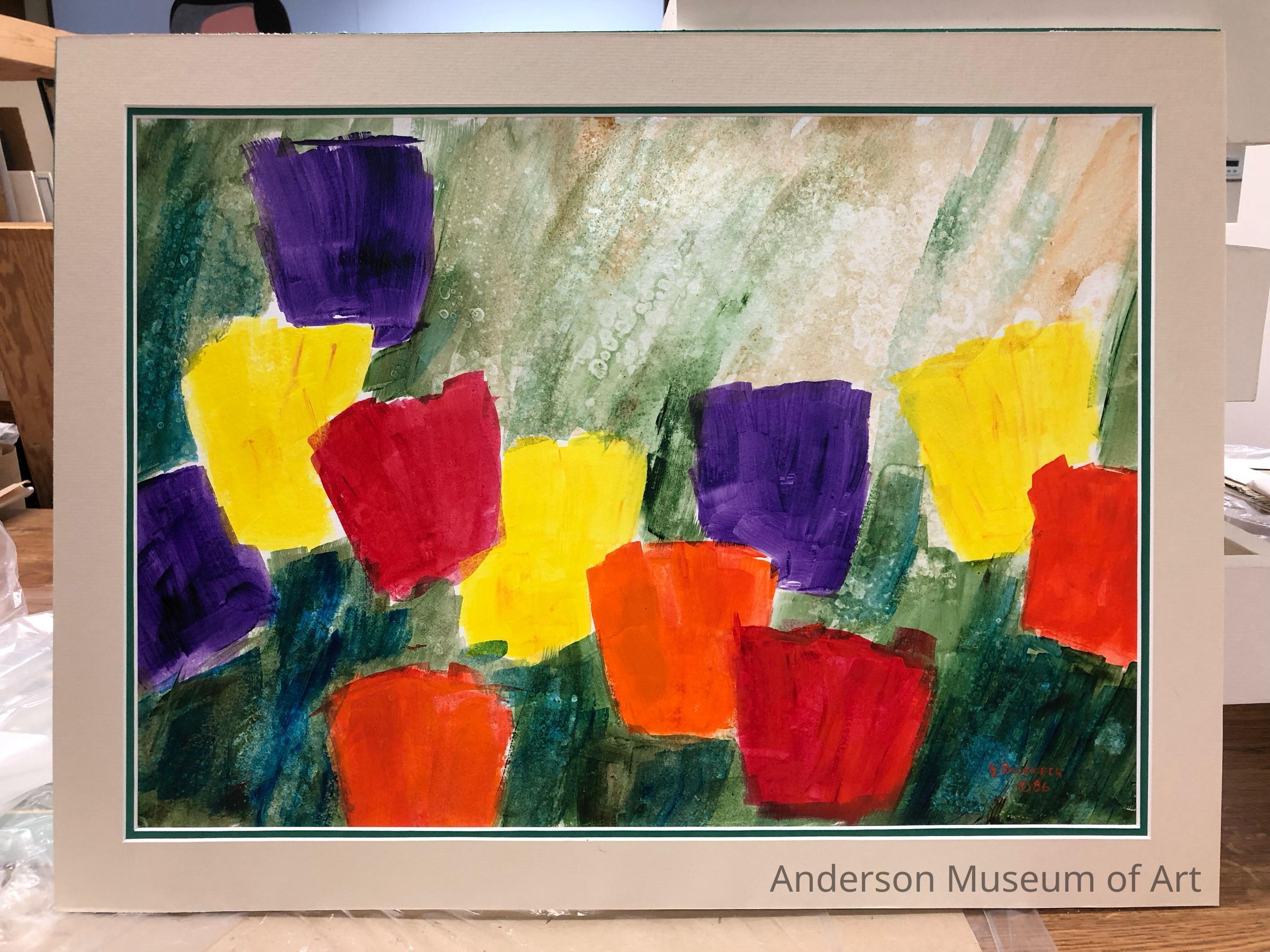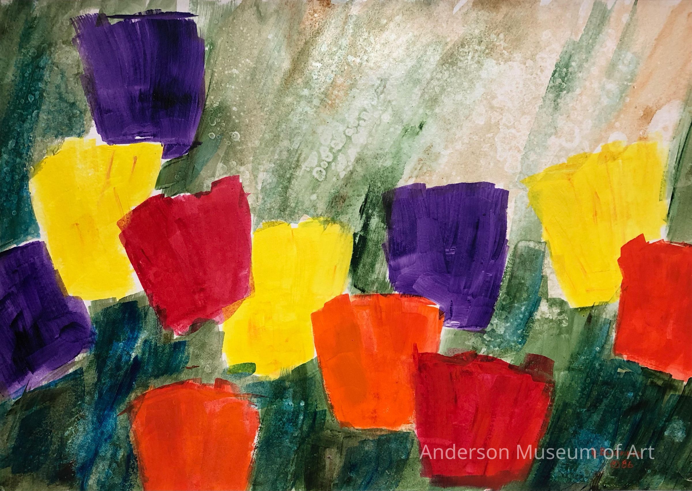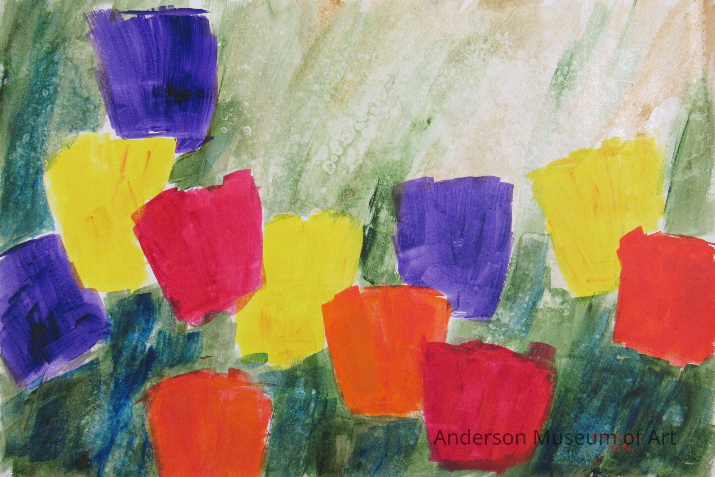 Abstract of possibly tulips. Blue, green, and brown brushed background. There are three orange, two red, three yellow, and three purple squares.