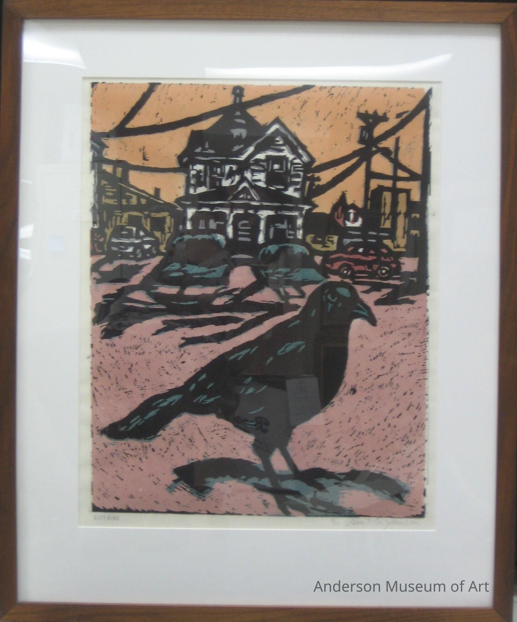 The piece is a Linocut that depicts a black crow taking up the foreground facing the right. The crow takes up 1/2 of the composition and is highlighted with grey-blue tones. The ground is a light rust color speckled with black. In the center of the upper 1/3 of the composition, there is a two-story white house with 2 oblong bushes in front of the building. The bushes are the same color as the highlights on the crow. There is a red car parked on the building's right and a white car parked on the building's left side. Power lines occupy the upper 1/4 of the composition and run diagonally from the upper right down to the piece's left side. The sky is a dull orange and is speckled with black as well.
