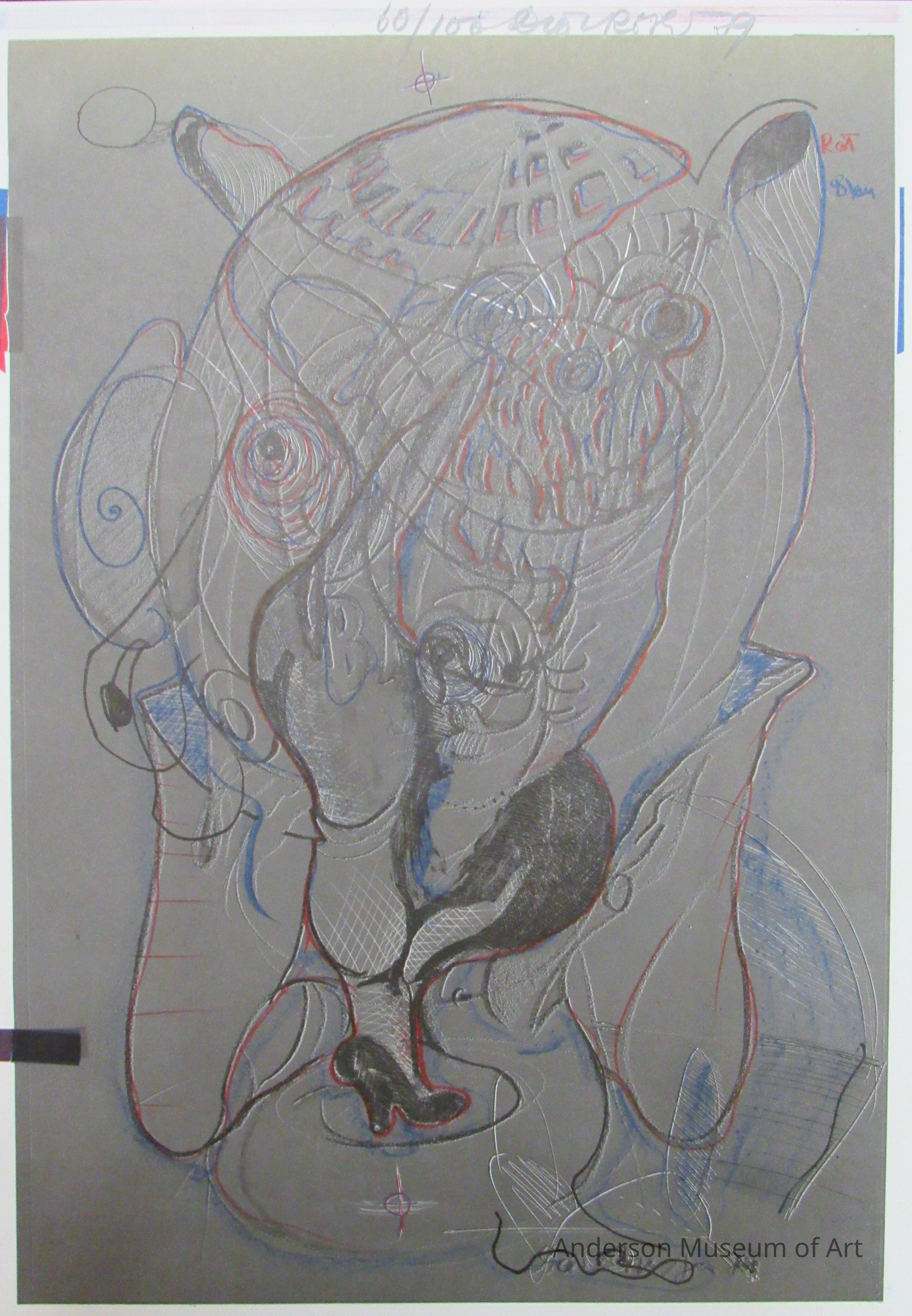 1979.27.1.6 - Grey background. Abstracted shape drawn in black, with blue suggestions of ears and arms and red used for shading. There is also the occasional use of white for highlighting. The words hell, rot, and blau are written backwards in the TLC. Signed in black crayon TLC "60/100 Dieter Roth 79".