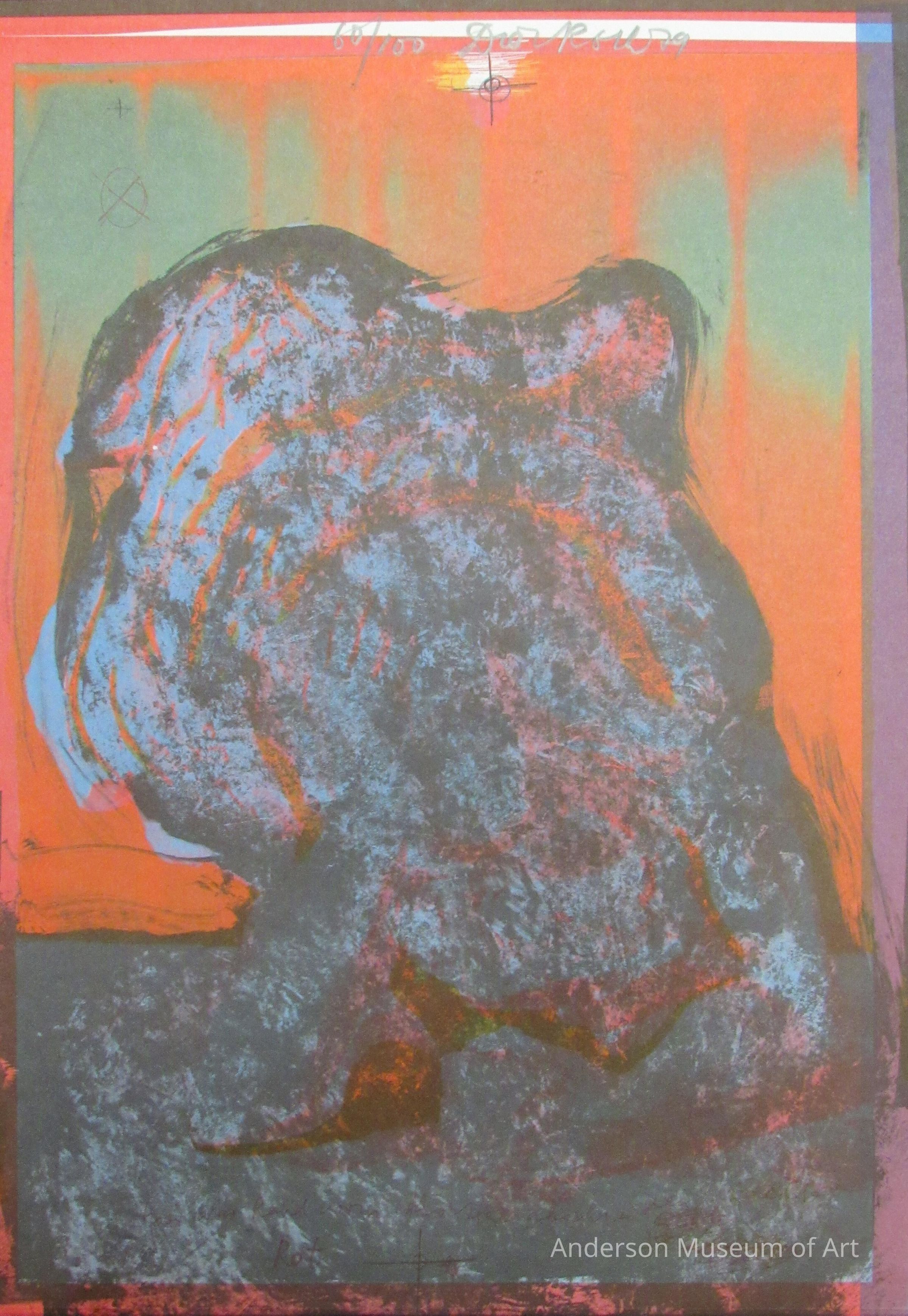 1979.27.1.10 - Pink and purple background. There is an orange and black abstracted sculpture in the center. At the top of the sculpture there is a naked human shape on hands and knees with a dog head. There is a rectangular shape protruding from the top left of the shape. The base is textured as though someone took a tool to clay to make lines. "Rot" and "Blau" are written in black just below the sculpture with rot scribbled out. Signed LRC in graphite "60/100 Dieter Roth 79."