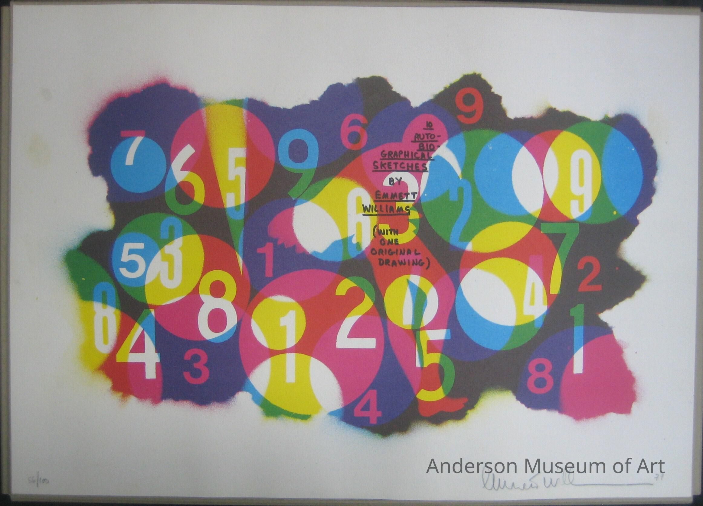 1990.1.1.1 - Cardboard covering with print attached to front. Print is multicolored with different sized numbers and circles throughout. Written in black along the center on a mostly pink figure "10 / AUTO- / BIO- / GRAPHICAL / SKETCHES / BY / EMMETT / WILLIAMS / (WITH / ONE / ORIGINAL / DRAWING). Signed and numbered in pencil. Print 56/100.