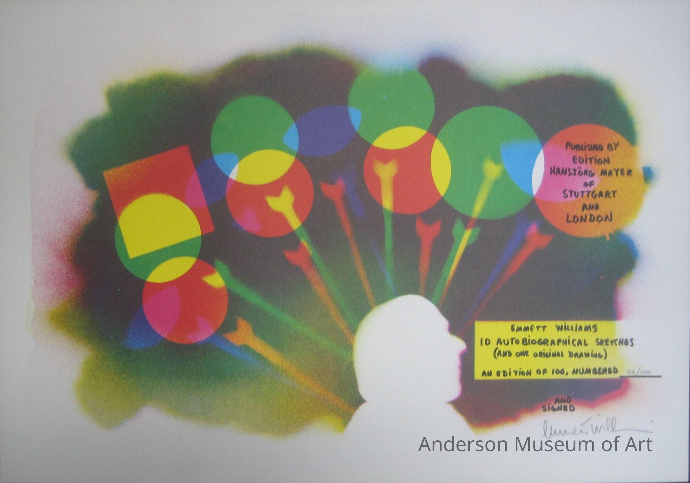 1990.1.1.2 - Multicolored print. Eight circles across the center with the far right circle contains black text "Published by /edition / Hansjorg Mayer / of / Stuttgart / and / London." There is one square on the left. Arrows point downward to a single white silhouette of a man. To his right is a yellow rectangle with black text "Emmett Williams / 10 Autobiographical Sketches / (and one original drawing) / an edition of 100, numbered 56/100". Below in black "and signed" and then in pencil "Emmett Will". 13.875 x 19.75. Signed LR corner.