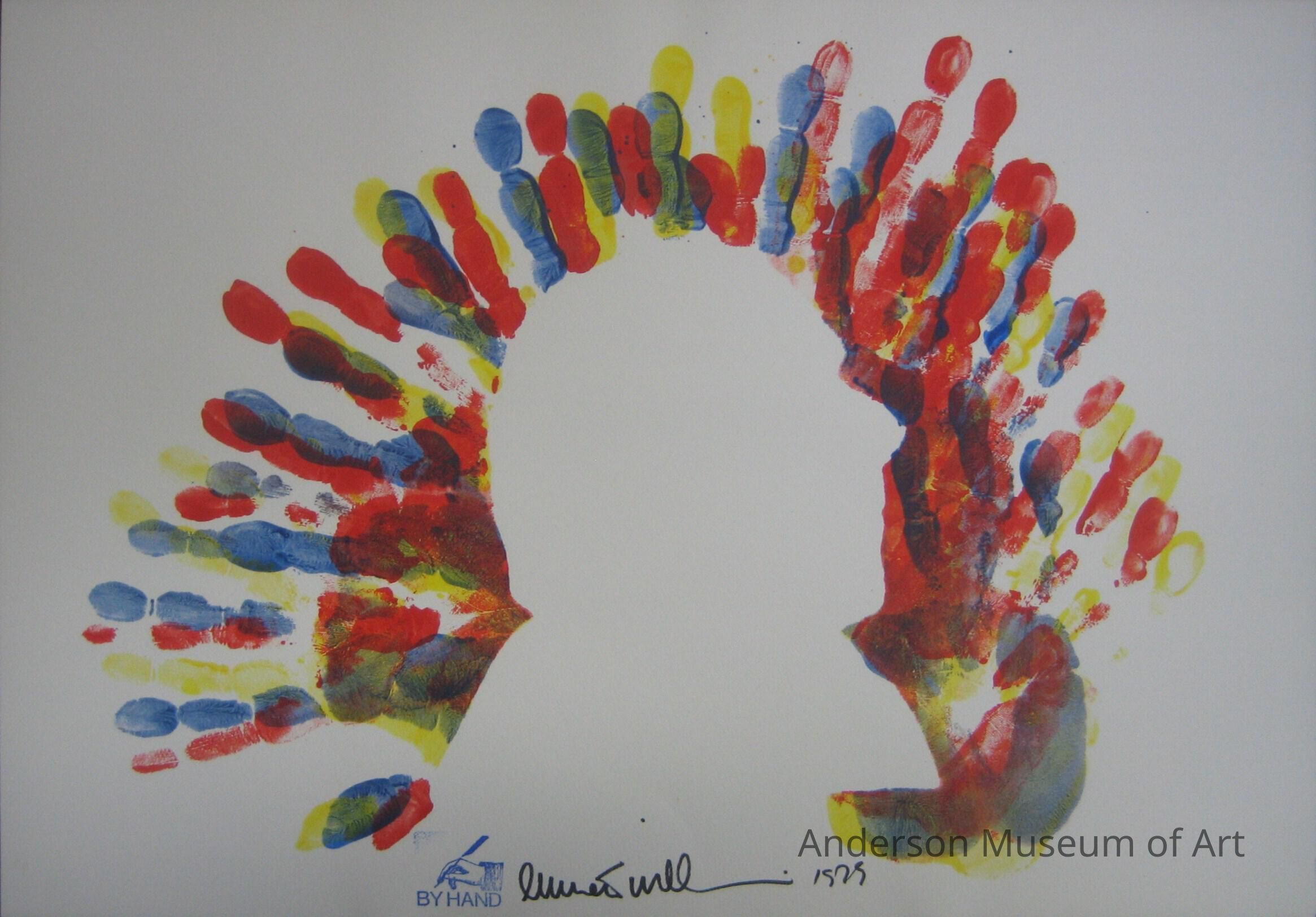 1990.1.1.3 - Layered handprints in blue, yellow, and red. The handprints create the silhouette of the sideview of a man's face in the center. There is a blue stamp next to his signature that says "BY HAND". Signed in black marker. 13.875 x 19.75. Signed bottom center.