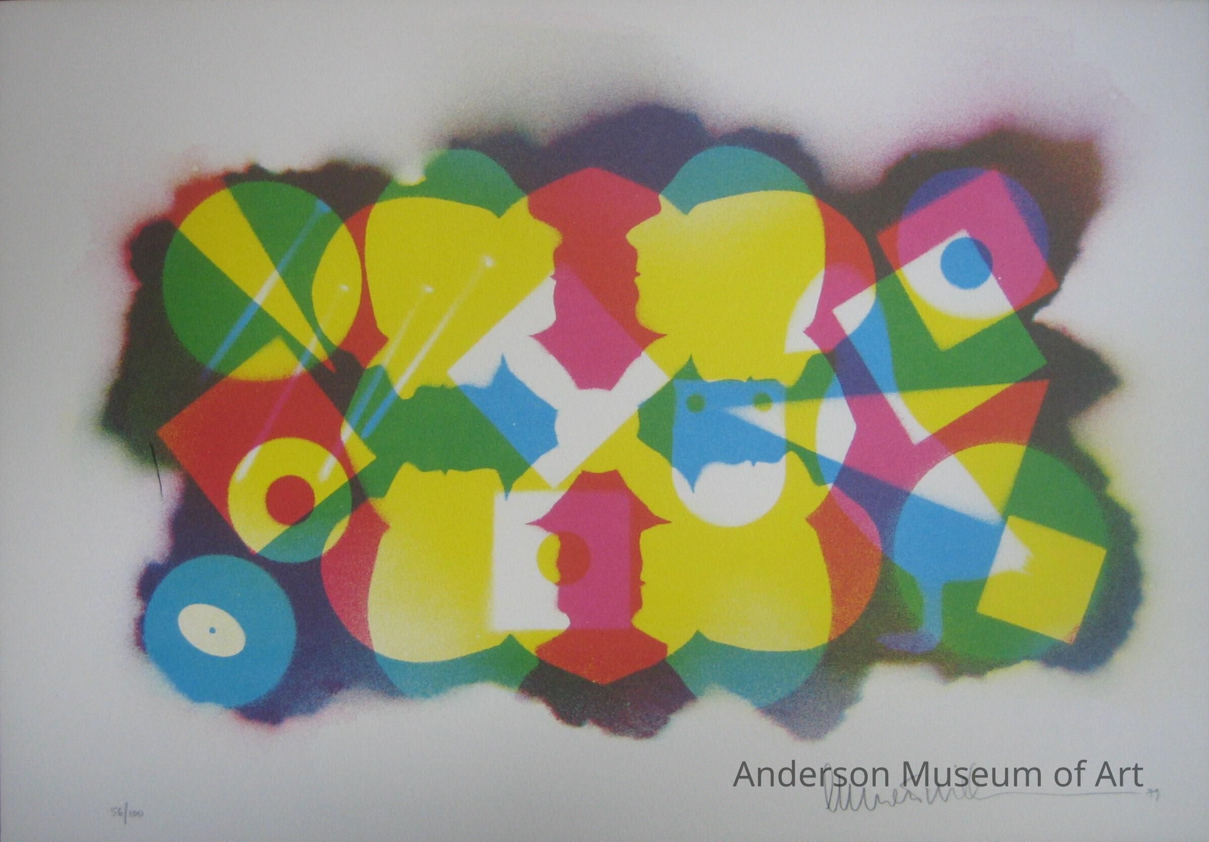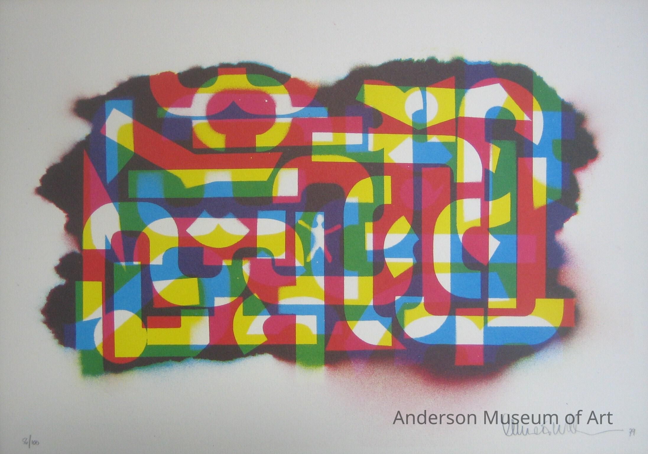 1990.1.1.10 - Multicolored print. Block letters layered on top of one another. Almost looks like a piping system. There is a small white silhouette of a figure in the center. Print 56/100. 13.875 x 19.75. Signed LR corner.
