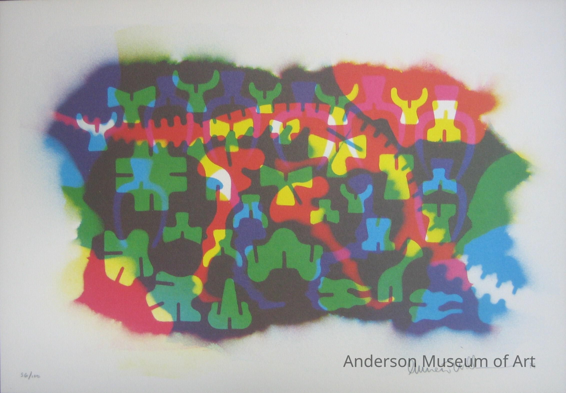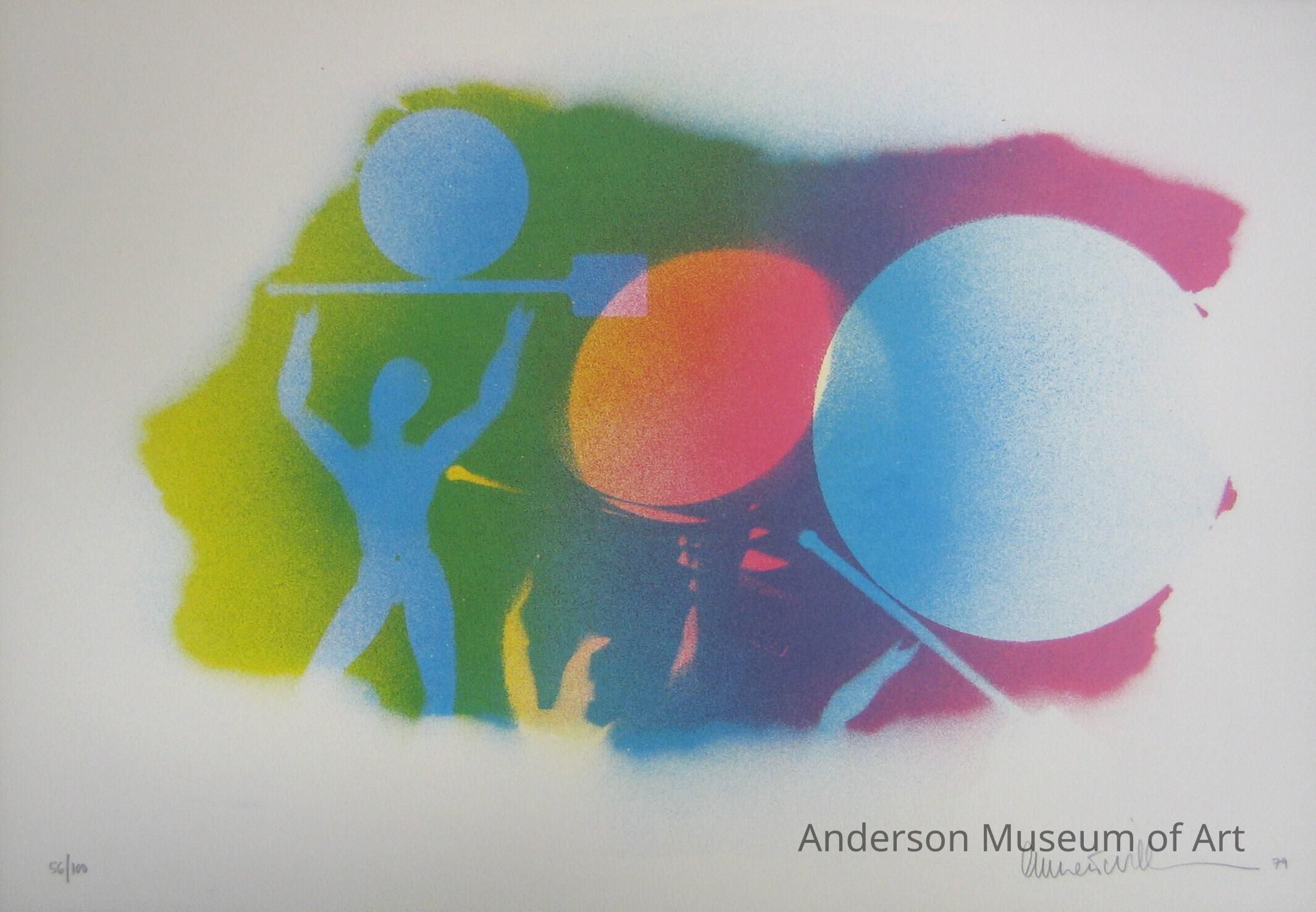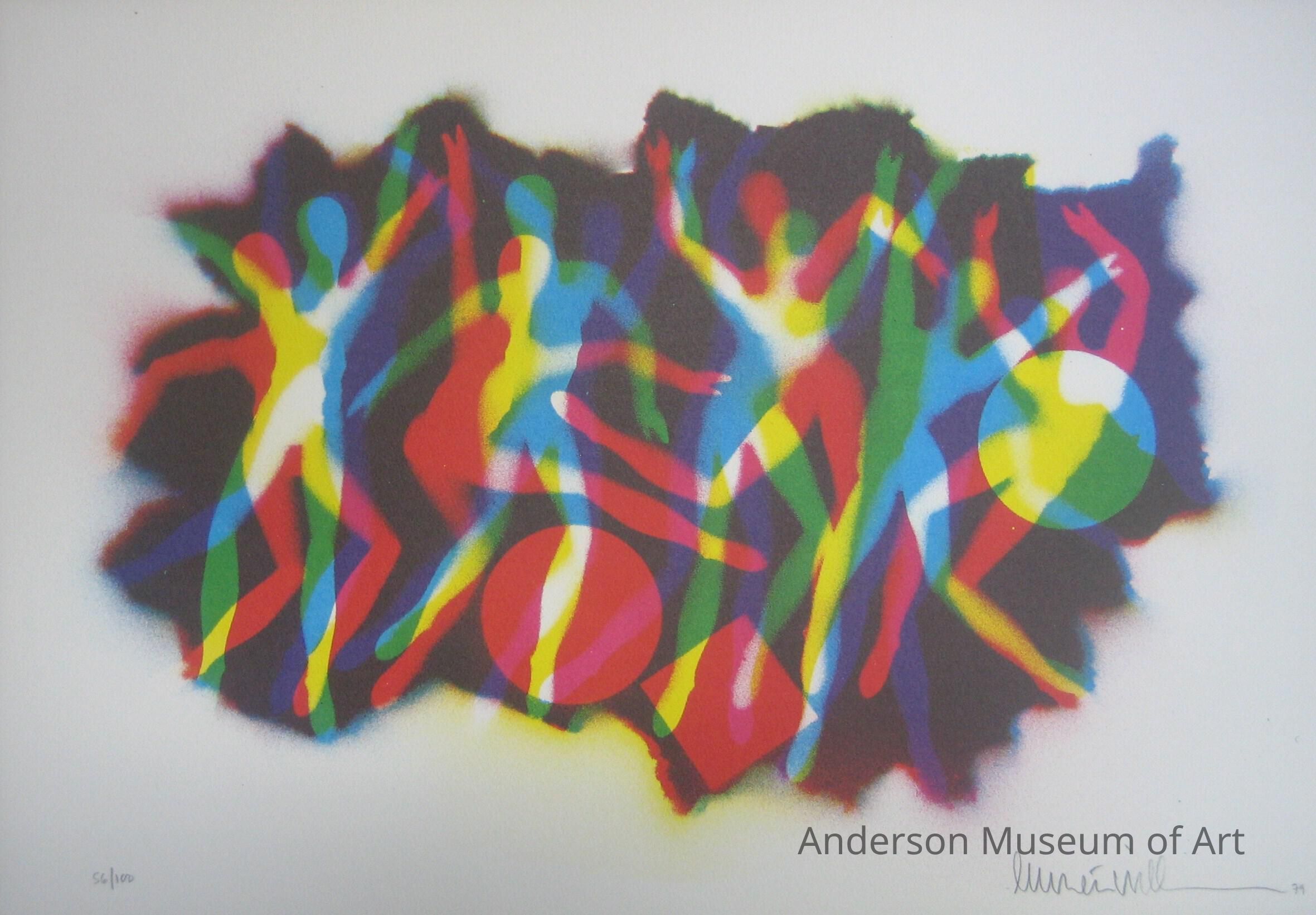 1990.1.1.8 - Multicolored print. There are several repeating figures in dance-like movements across the page. There is a red circle and square at the bottom and another circle on the right. Print 56/100. 13.875 x 19.75. Signed LR corner.