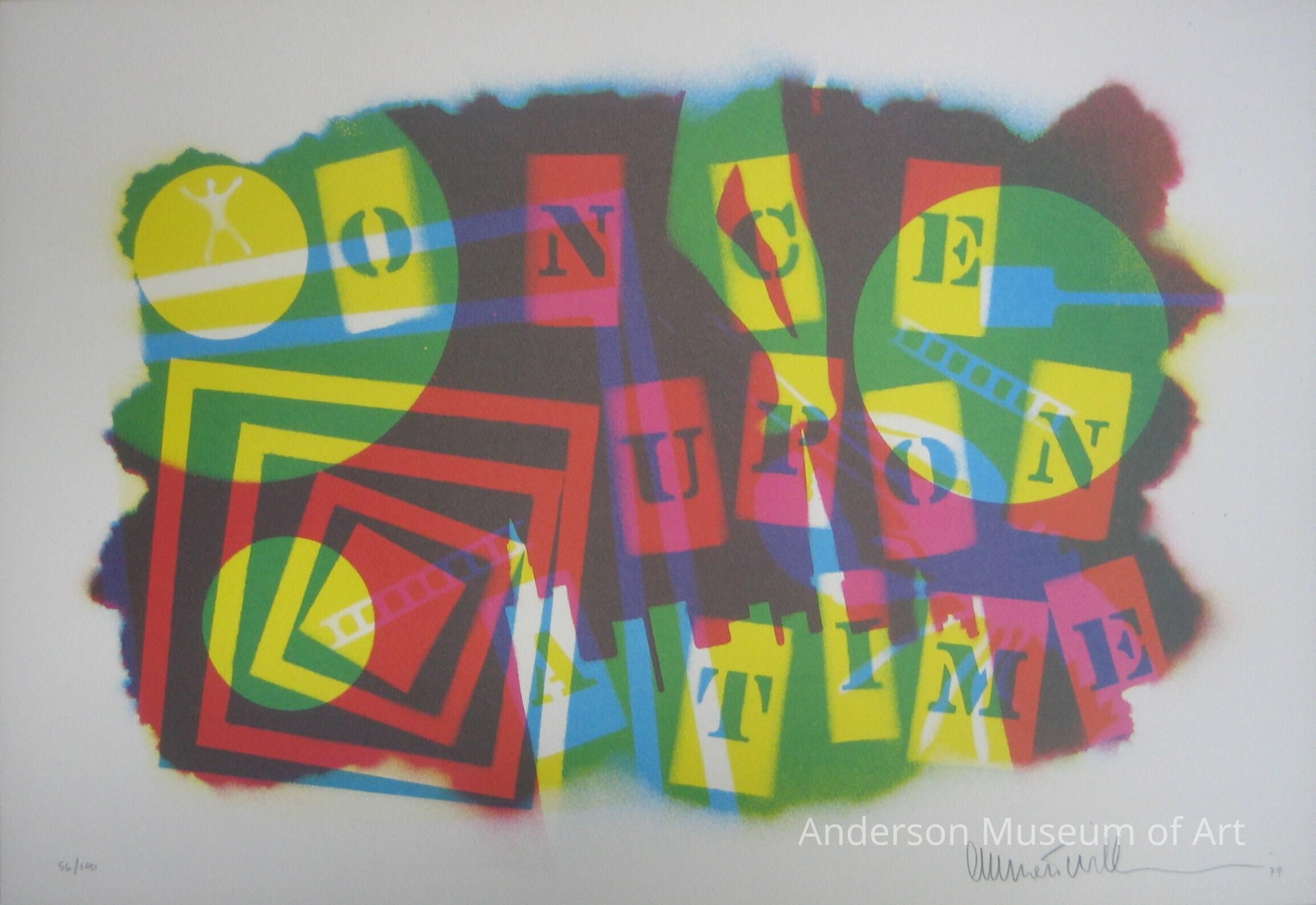 1990.1.1.6 - Multicolored print with kaleidoscope appearance. "Once upon a time" is printed with stencils across the print. There is a large green circle near the 'o' of once and another near the 'o' and 'n' of upon. There are three repeating squares with a full square in the center along the bottom left. 13.875 x 19.75. Signed LR corner.