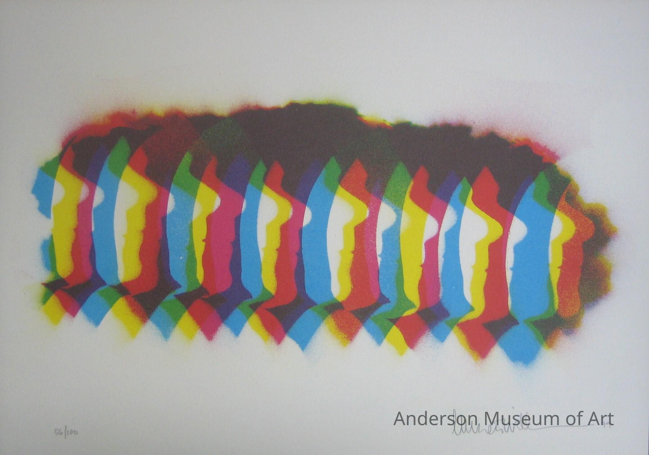 1990.1.1.11 - Multicolored print. Repeating silhouettes of the side view of a man's face looking right. Print 56/100. 13.875 x 19.75. Signed LR corner.