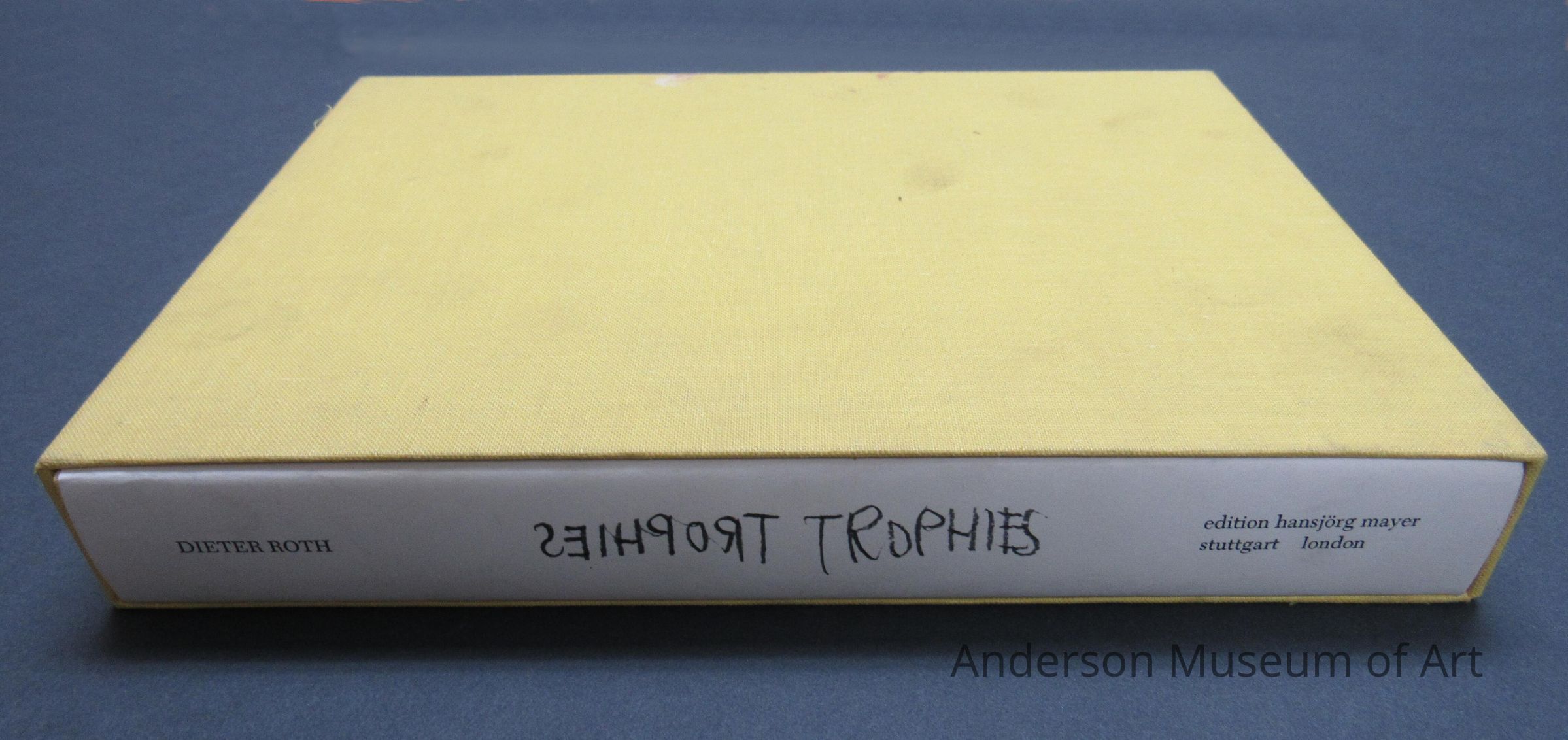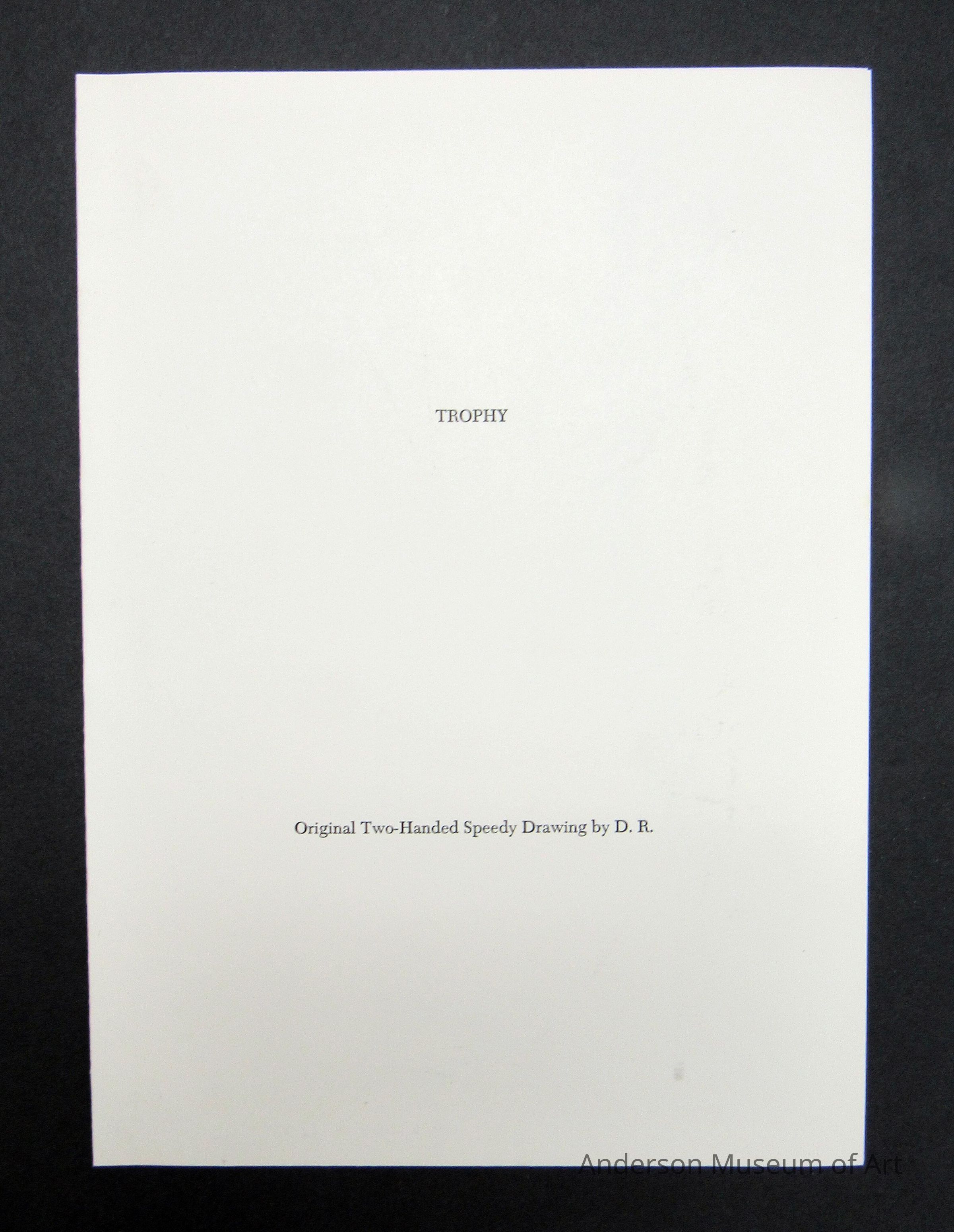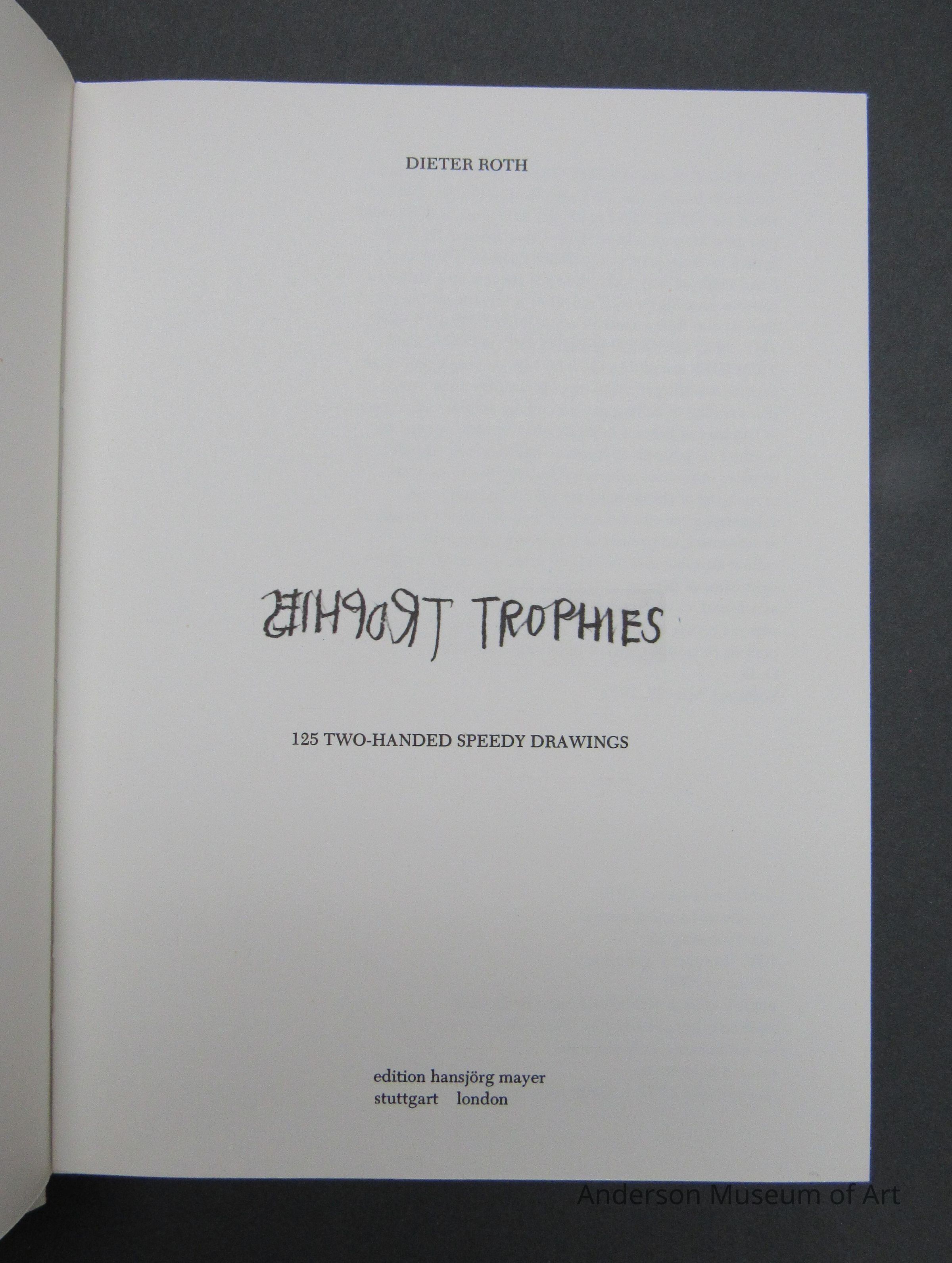 Book with white jacket cover with a top view photo of the artist drawing. It is on both sides. The book itself is yellow and matches the slipcase. Book comes with an original drawing "Trophy / Original Two-Handed Speedy Drawing by D.R." The drawing is of a figure holding two knife like objects that each say trophy. It is signed in pencil and dated 78/79. The book is made up of 125 two-handed speedy drawings. Edition Hansjorg Mayer. Copyright 1979. Printed in Germany.