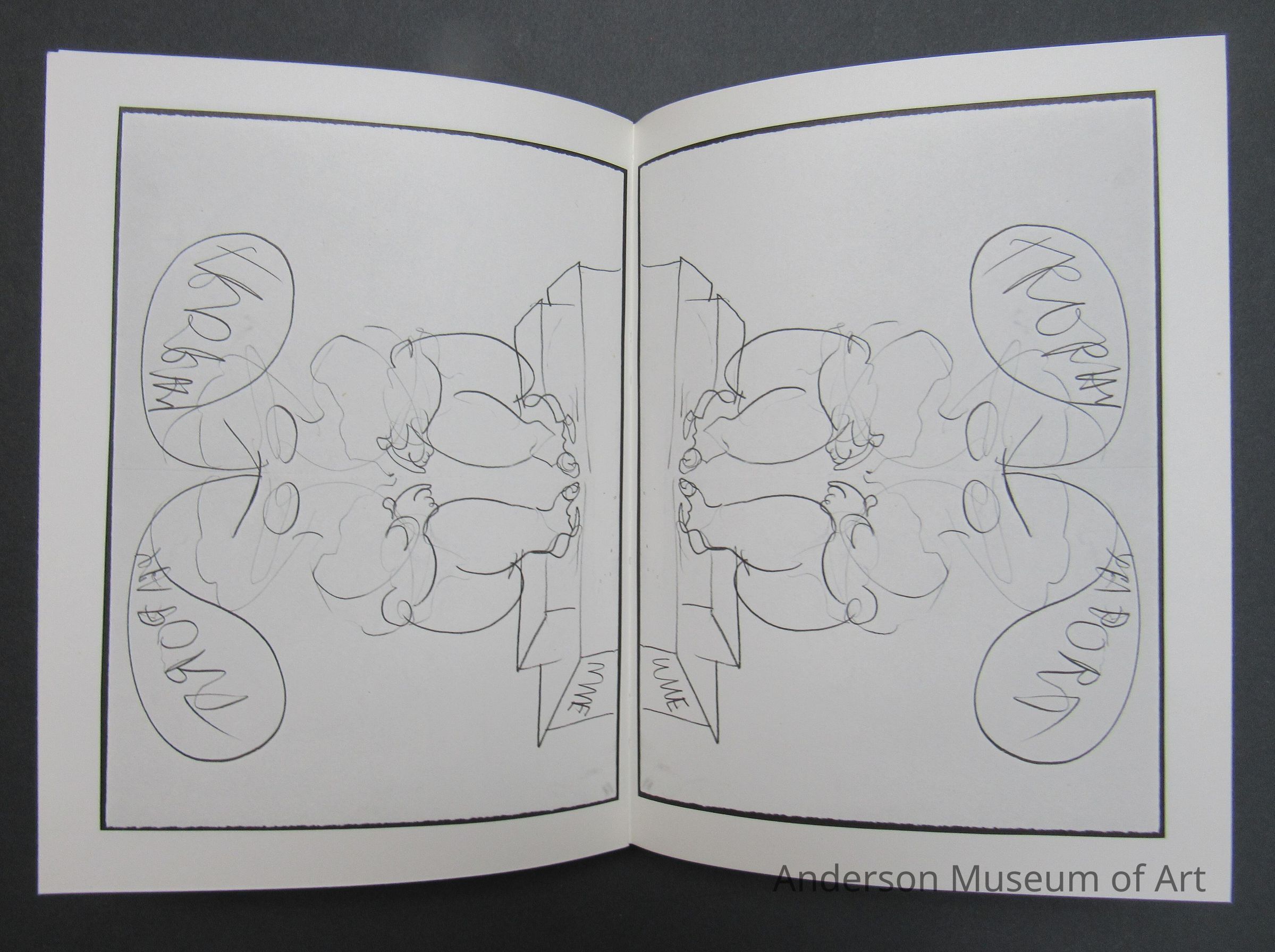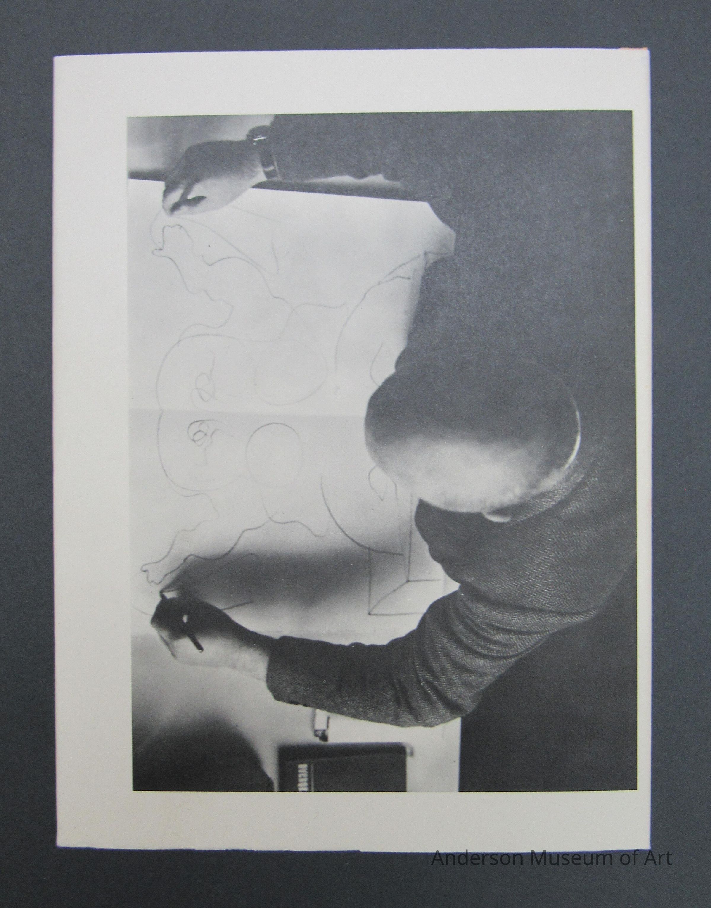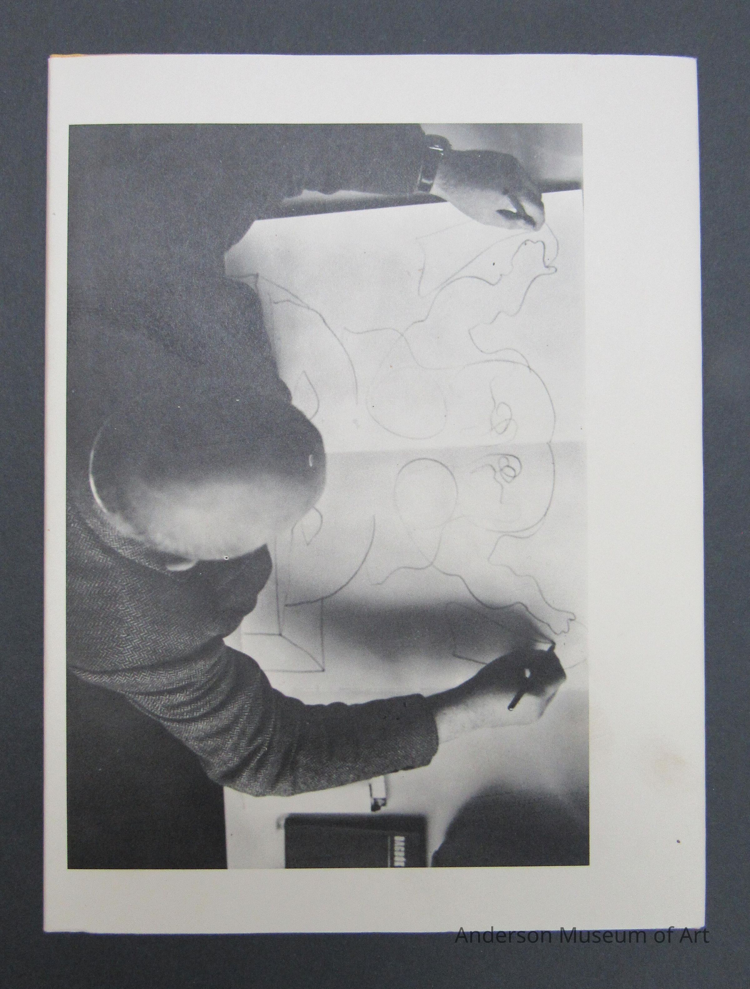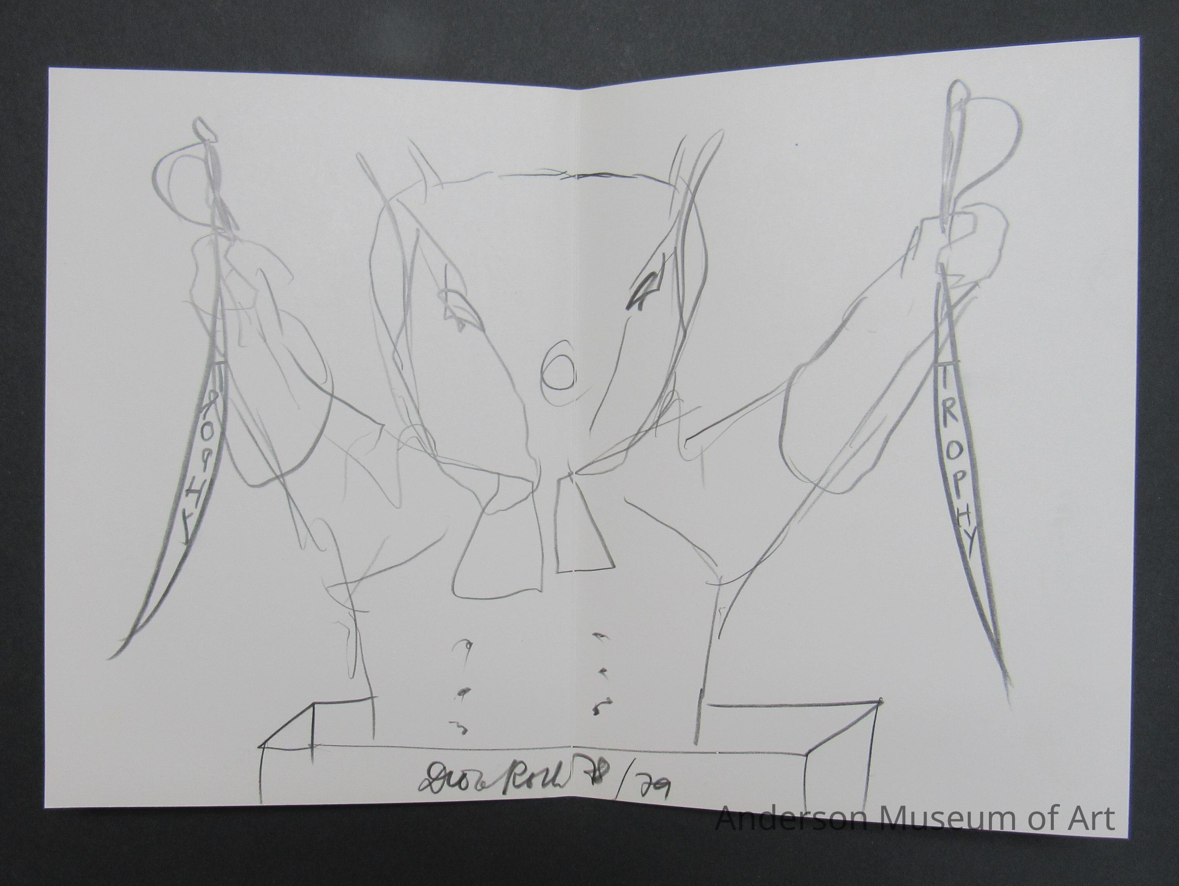 Book with white jacket cover with a top view photo of the artist drawing. It is on both sides. The book itself is yellow and matches the slipcase. Book comes with an original drawing "Trophy / Original Two-Handed Speedy Drawing by D.R." The drawing is of a figure holding two knife like objects that each say trophy. It is signed in pencil and dated 78/79. The book is made up of 125 two-handed speedy drawings. Edition Hansjorg Mayer. Copyright 1979. Printed in Germany.