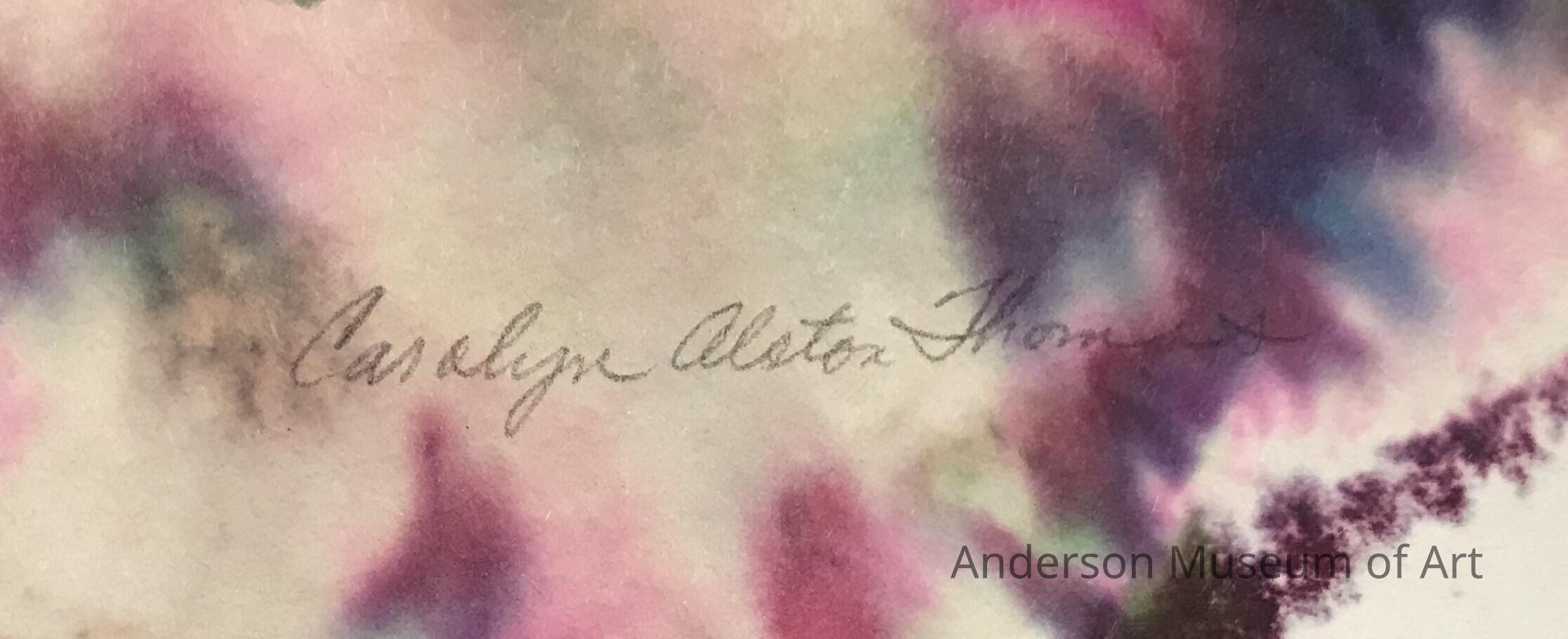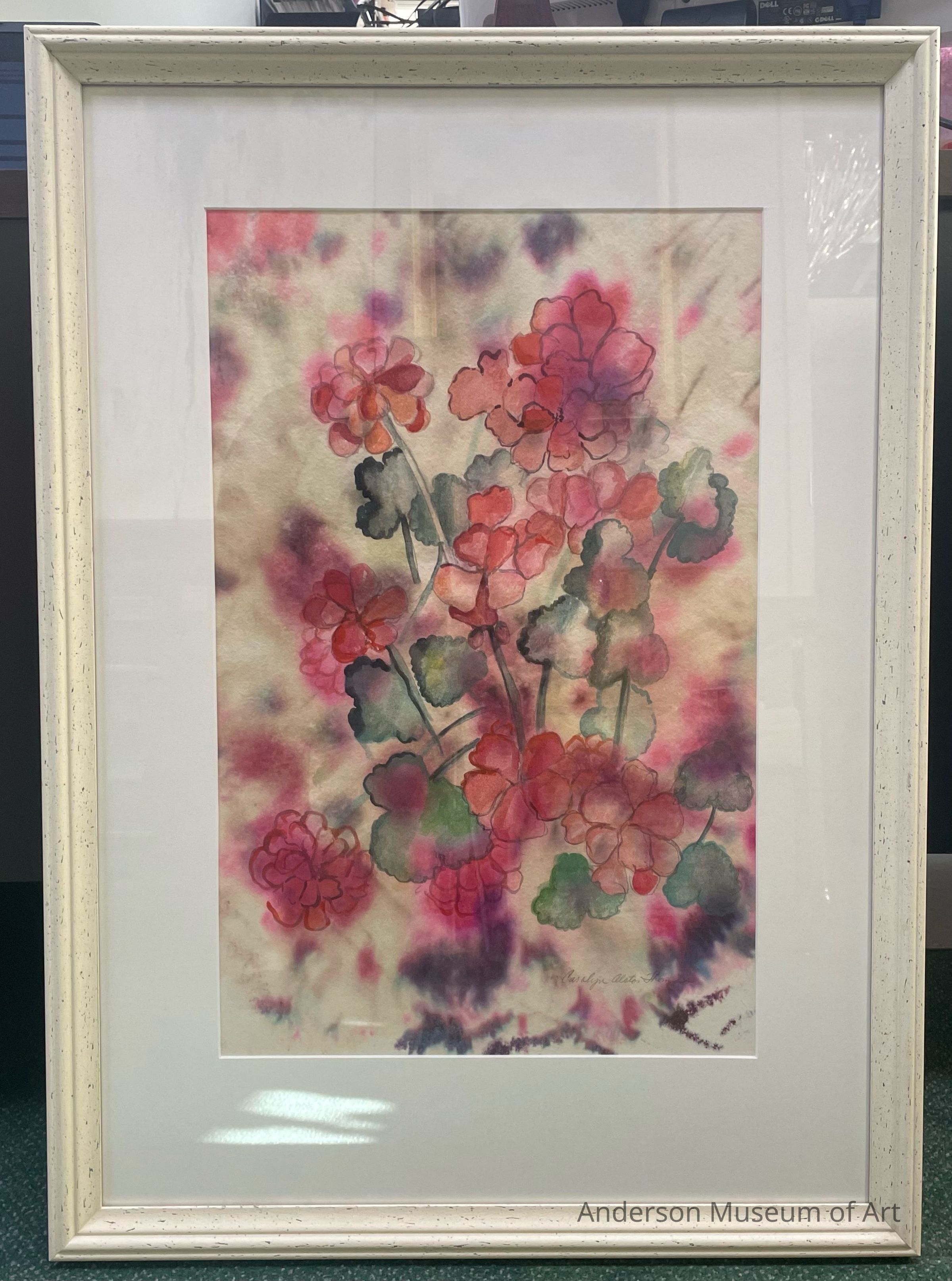 Watercolor of pink geraniums on deckled paper. There are roughly 10 geraniums bunched together as well as green leaves throughout. Roughly half are reaching to the top and the other half towards the bottom. The background has a tie dye feel with purples, pinks, blues, and some browns. Signed Carolyn Alston Thomas in the LRC in pencil.