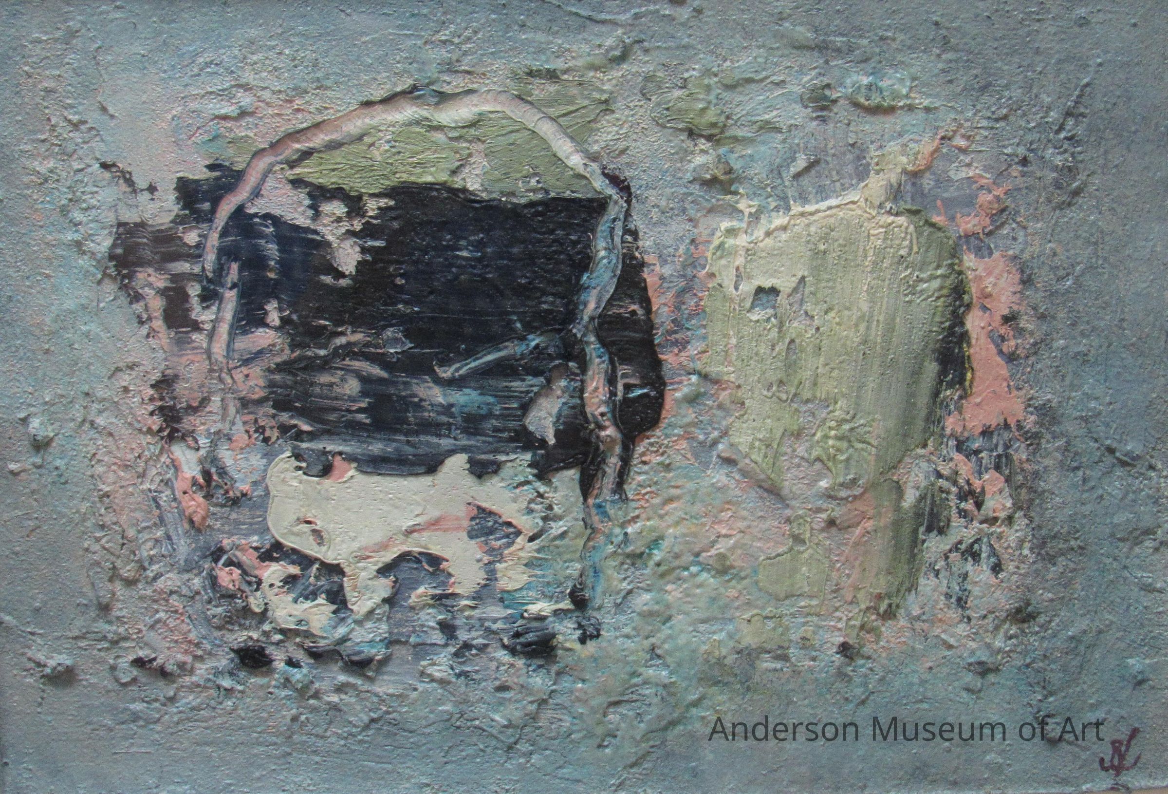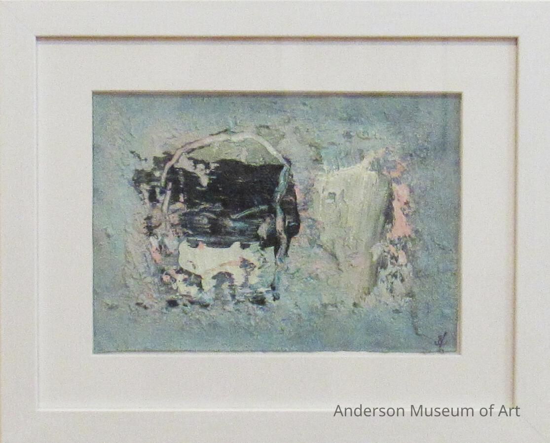 The abstracted landscape of Kilcatherine in Ireland where the artist resides. The color palette includes blue-gray, black, cream, peach, blue-green, green, and hints of yellow. Evidence of a scraping pattern indicates that this work was painted with a palette knife. There are numerous layers of thickly applied paint. In the center of the work are two bold regions of color--one is a large black field and the other is a green field. Kingerlee "signs" this work with his symbol of a man in a boat in the lower right corner written in burgundy paint.