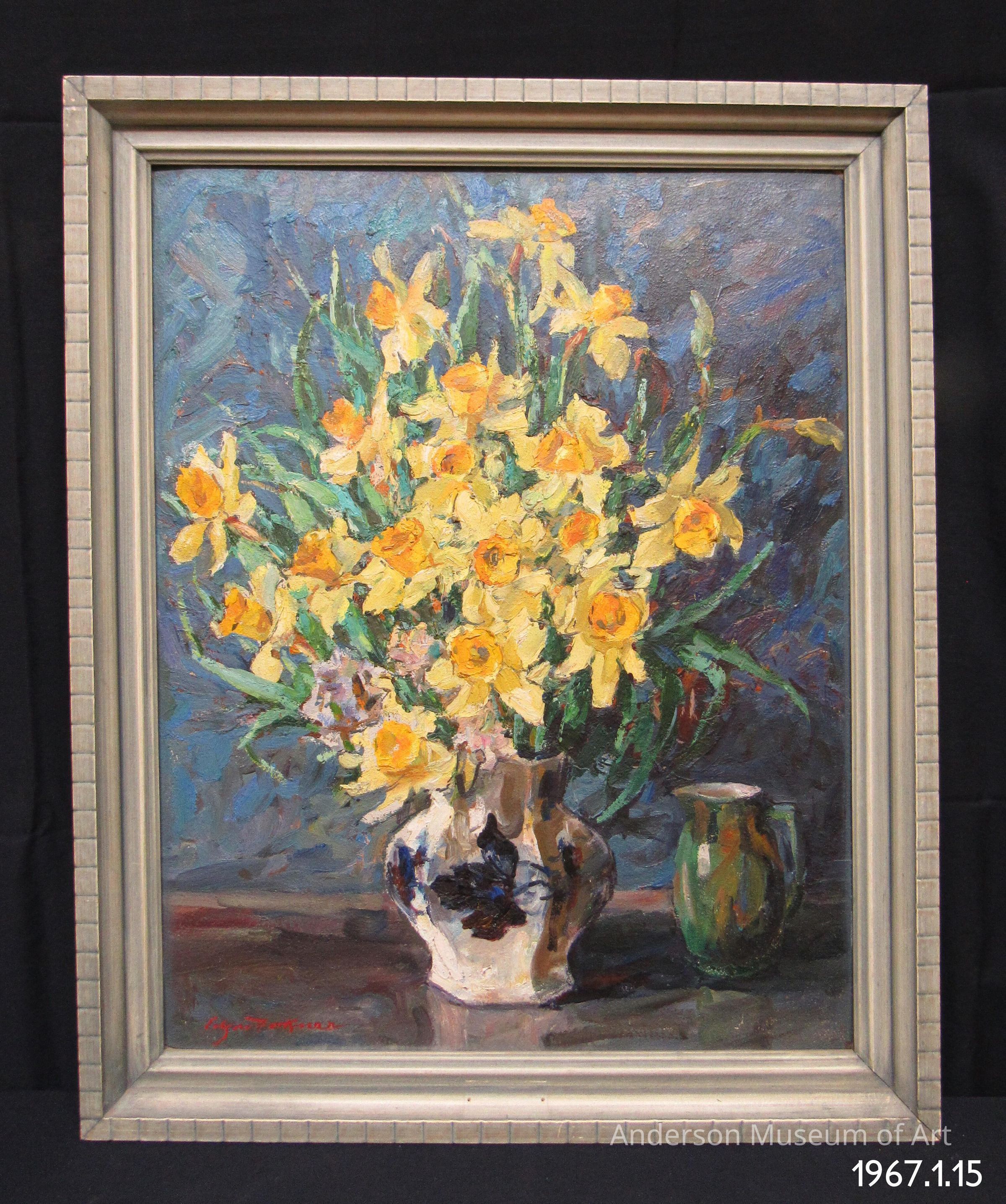 Oil on academy board depicting a floral still life. Central is a white vase with a leaf pattern in blue and violet which contains a number of daffodils and long leaves. To the right is a green pitcher. Both vessels rest on the ground and the background is a textured blue and green color with shadows on the right side. The painting is framed in a wooden frame with a linted pattern painted green-grey. The painting is signed in the lower left corner in red paint "Edgar Forkner". On the verso are two tags, one is the academy board manufacturere;s label from F. Weber Co. located in the upper right corner. The other is a small label on the bottom left corner which reads "13-28/ $125.00" in pencil. A brass plaque reading "DAFFODILS; EDGAR FORKNER; ANDERSON CIVIC ART ASSOCIATION" was taped to the verso and is now located in the accession file.