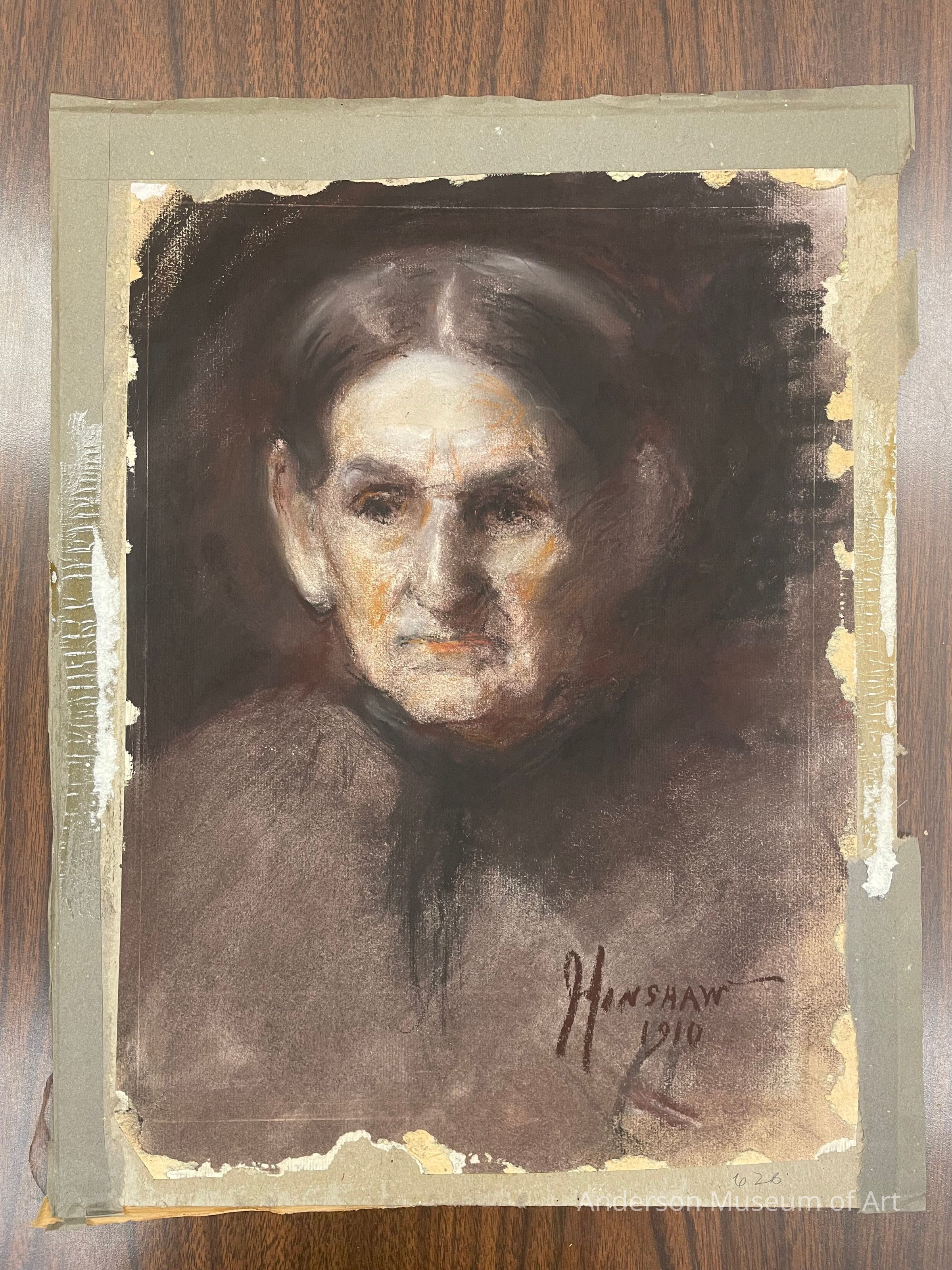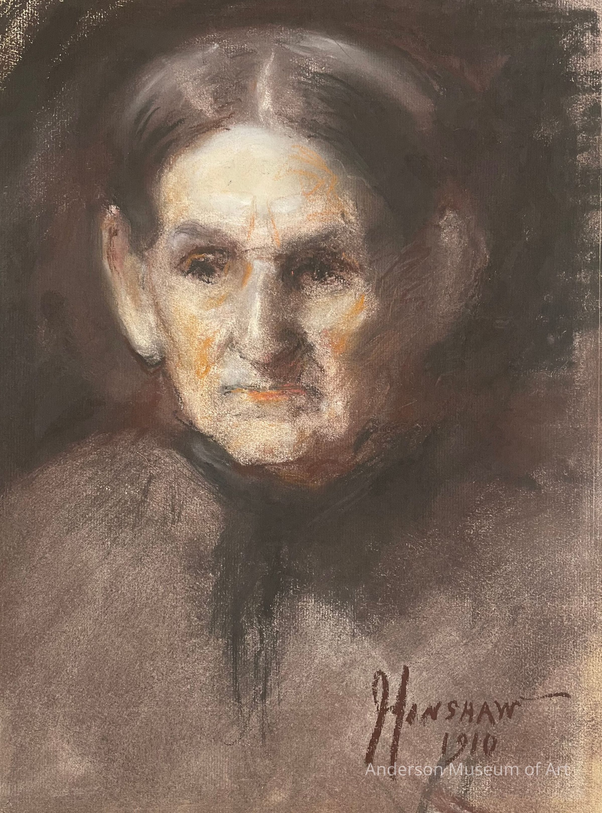 Pastel portrait of an older woman. The paper appears to have been creme but Glenn has covered it in dark tones. The woman's head is the focus surrounded by dark. She is slightly angled towards the viewer's left. Her dark hair is pulled back and her ears and nose stand out. There are hints and highlights of orange on her face. Signed Hinshaw 1910 in black pastel in the BRC.