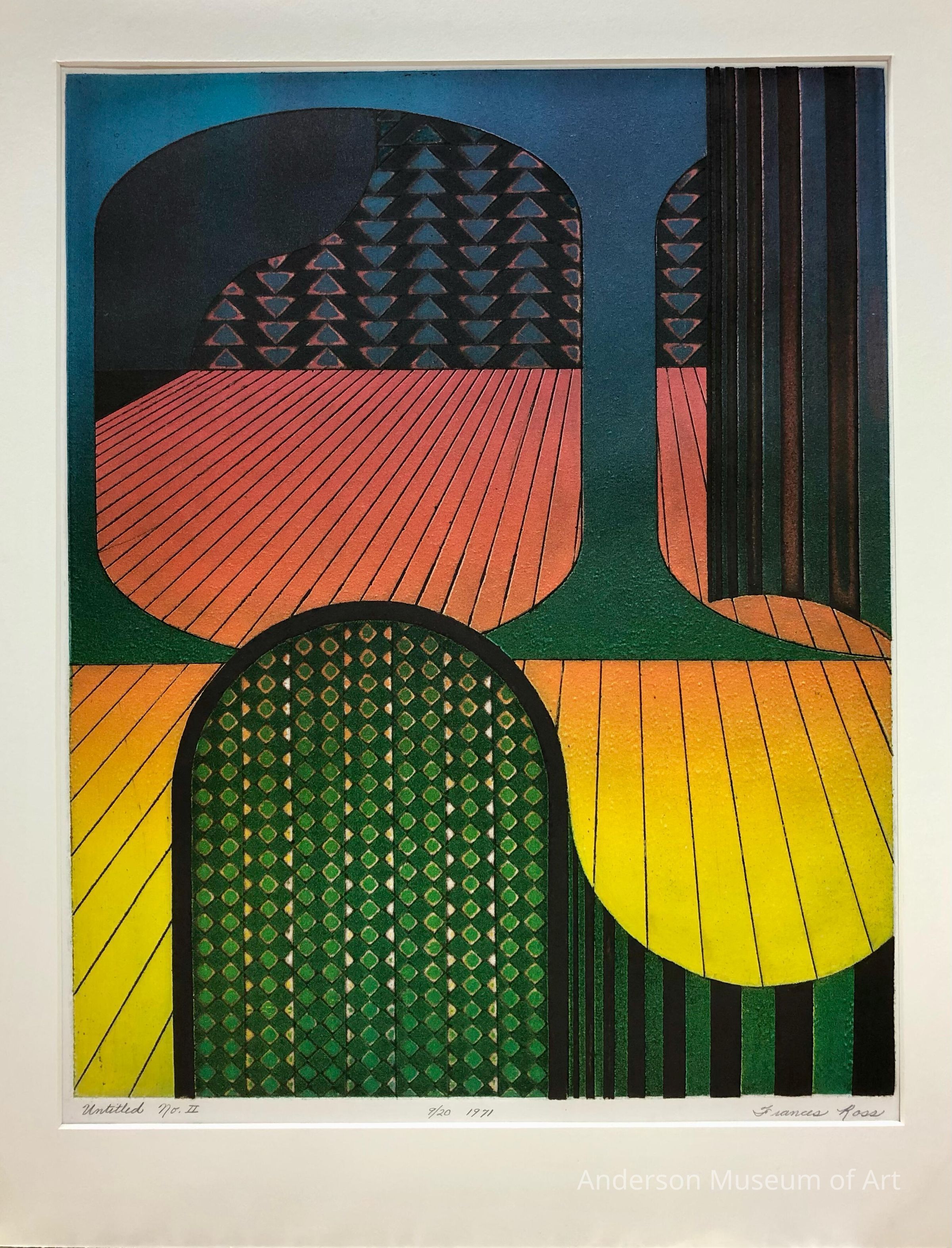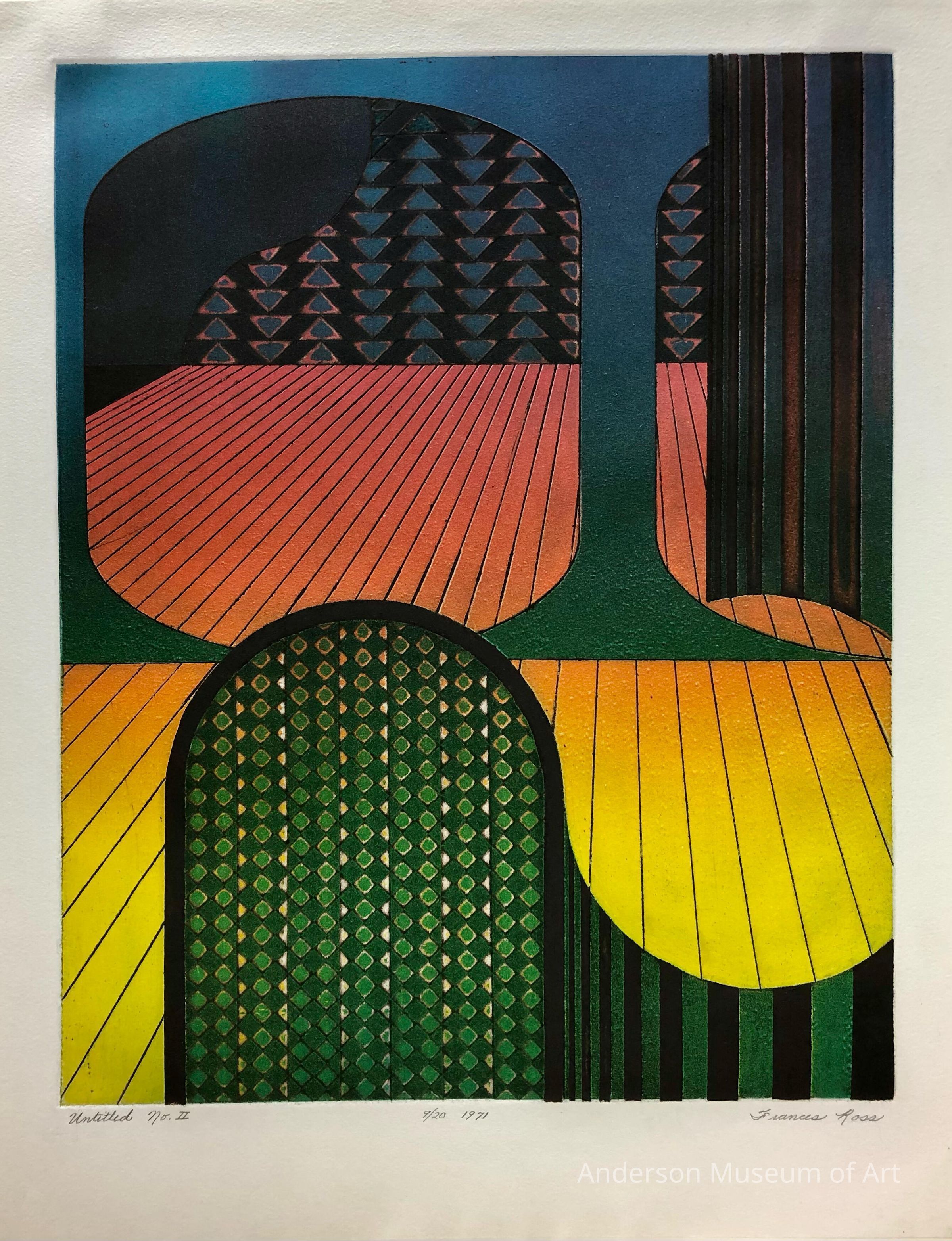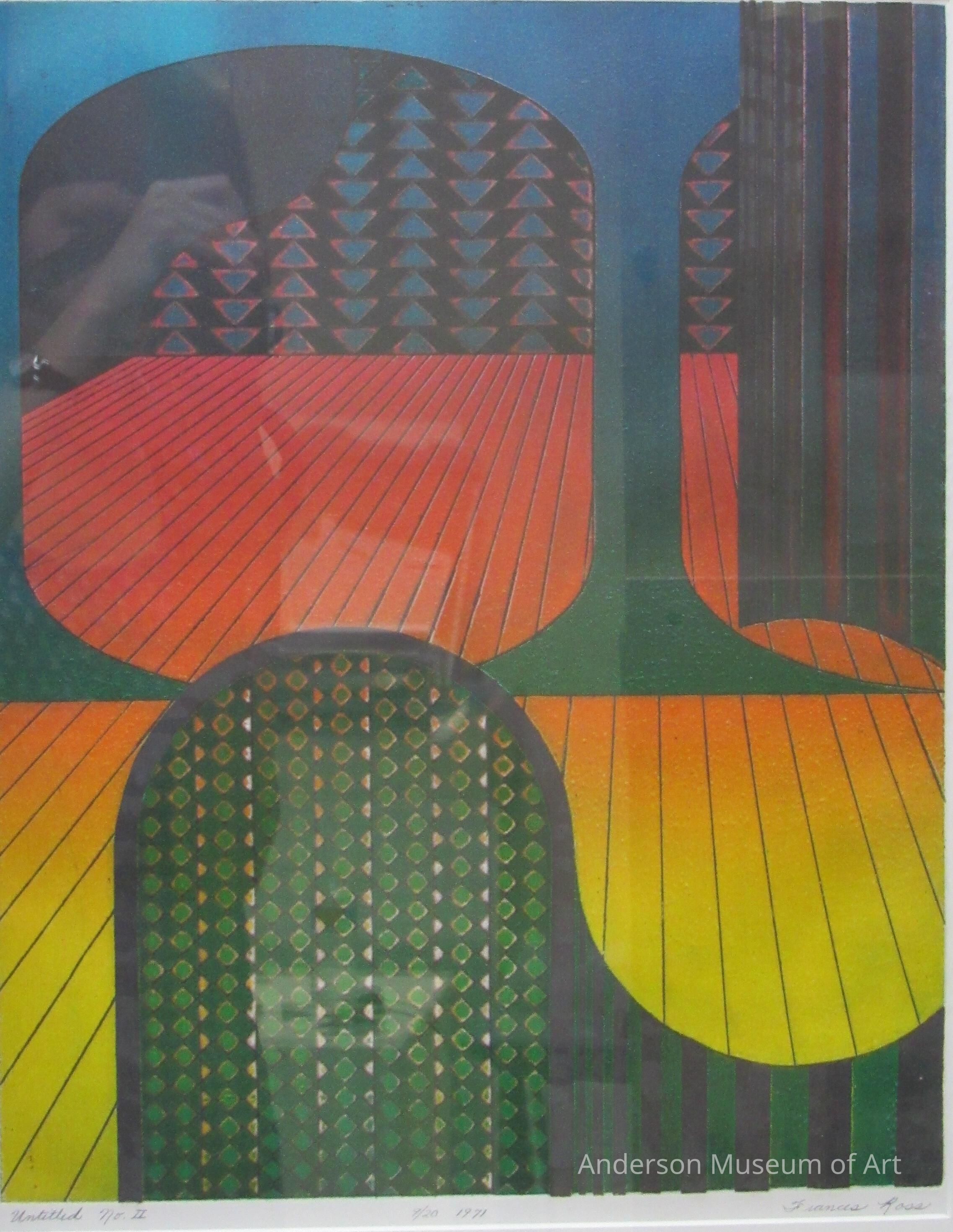 9/20 In the foreground is an object like a door for an archway, which combines with a curved and striped form. In the middle ground, there is a support-like structure with two vertical beams and another curved form. In the background is a wall, shadowed with triangles. It is signed, dated, and numbered. It is signed "Frances Ross" in the lower right corner. "Untitled No. 2 / 9/20 1971 / Francis Ross"
